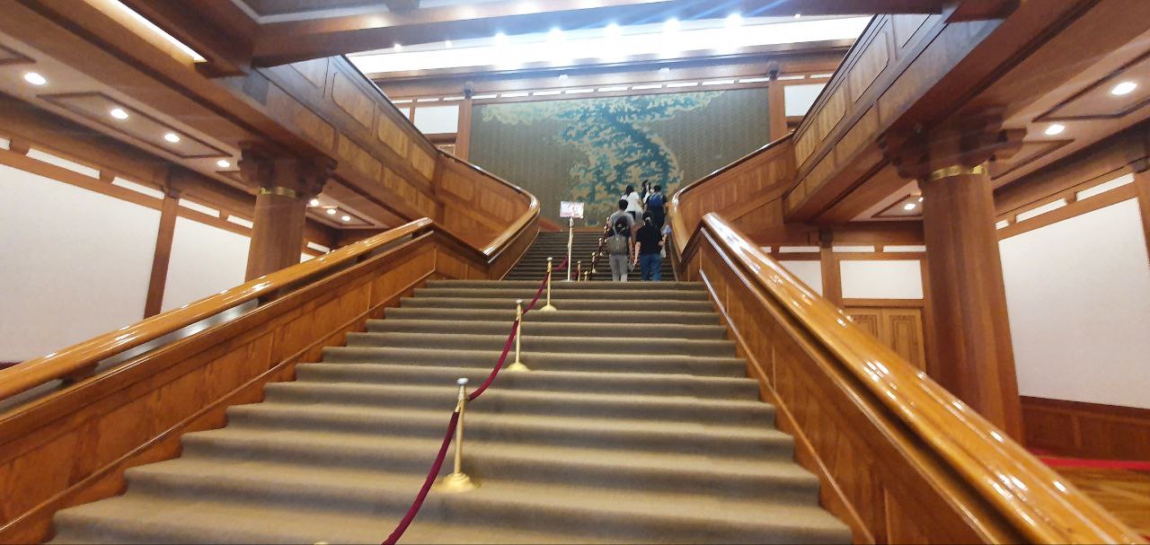 이제 중앙계단을 통해 2층으로 올라가게 됩니다. 거대한 한반도 그림을 보면서 올라갑니다. 기존 계단 위로 카펫을 덮어서인지모르겠지만 조심히 올라가셔야 합니다. 살짝 미끄럽습니다.