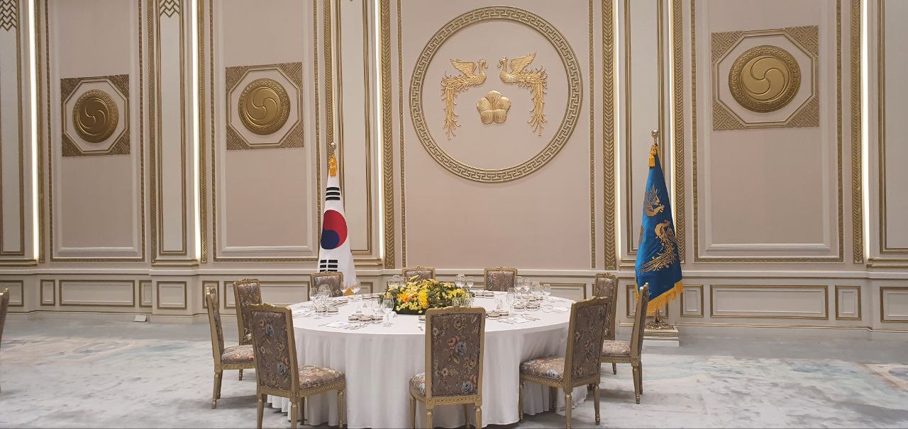 영빈관은 청와대에 국빈이 방문했을때 환영 만찬이나 행사가 진행되던 장소라고 합니다. 1층과 2층 만찬장이 따로 있는데 1층만찬장이 공개되었습니다. 영빈관 내부로 진입할 때는 반드시 신발에 덧신을 신고 입장을 해야 합니다. 고풍스러운 분위기가 신기했고 베이지 색과 금색 장식으로 산뜻하면서 고급진 느낌을 받았습니다. 내부에서 사진을 찍으시는 분들이 많이 계셨습니다. 되도록이면 사진을 찍을 때에도 마스크를 착용하시기 바랍니다. 영빈관 내부 공개된 곳은 저 곳이 전부입니다.