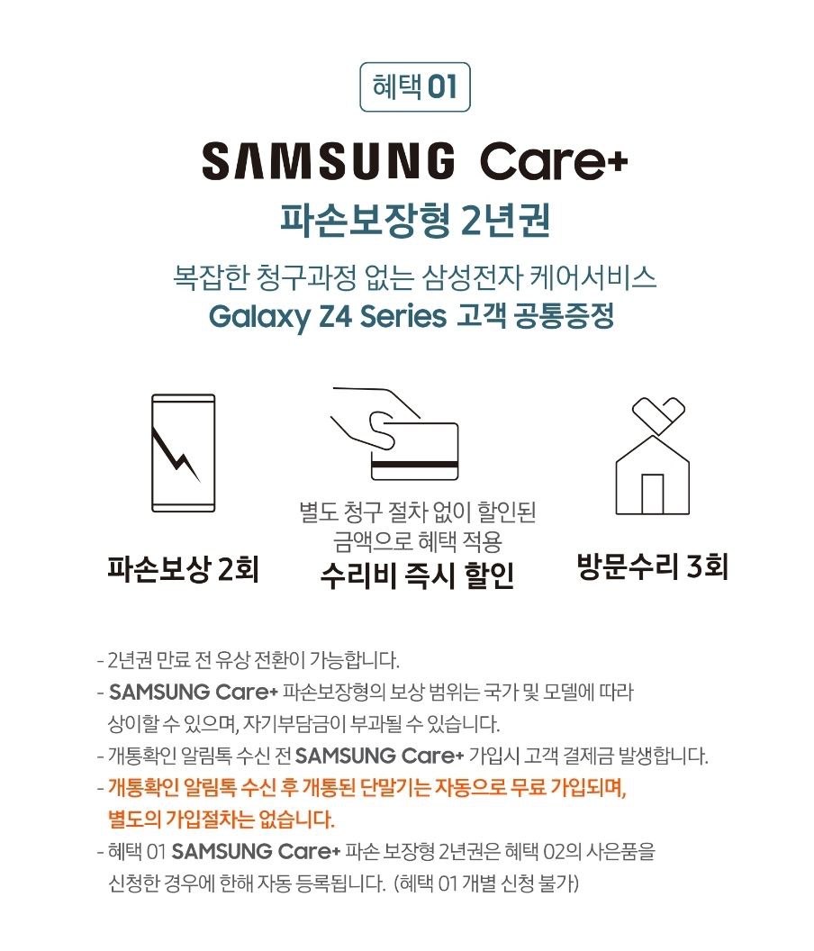 첫 번째, 폴드와 플립 구매자 공통으로 삼성케어플러스 파손보장형 2년권이 주어집니다.