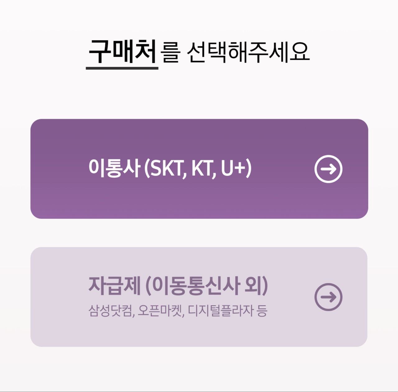 본격적으로 사전구매자 사은품 신청을 할 차례입니다. 먼저 통신사를 통해 구매하셨거나 / 온라인이나 오프라인으로 자급제 기기를 구매하신 분은자신의 구매 조건에 맞게 먼저 선택을 하시면 됩니다.