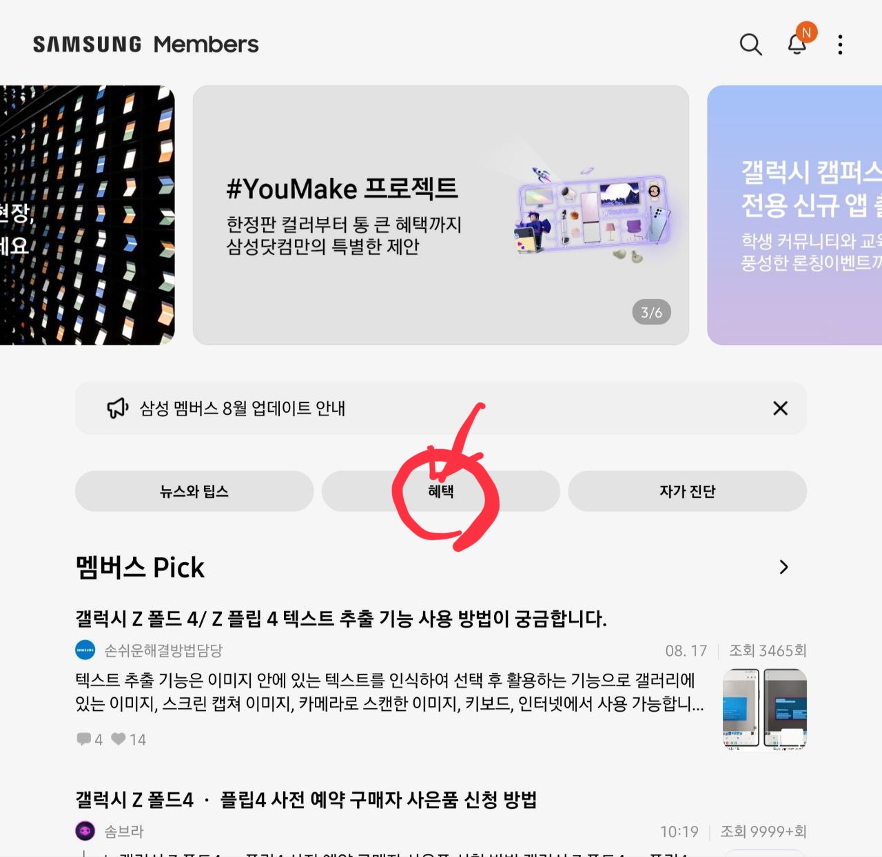 다음은 삼성멤버스 혜택에서 맨 윗줄 오른쪽에 있는 항목에 대한 이야기입니다.