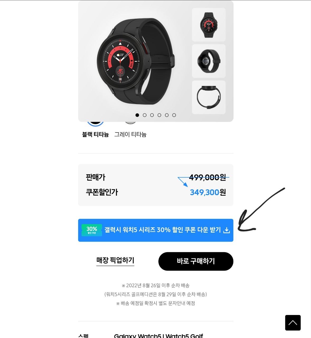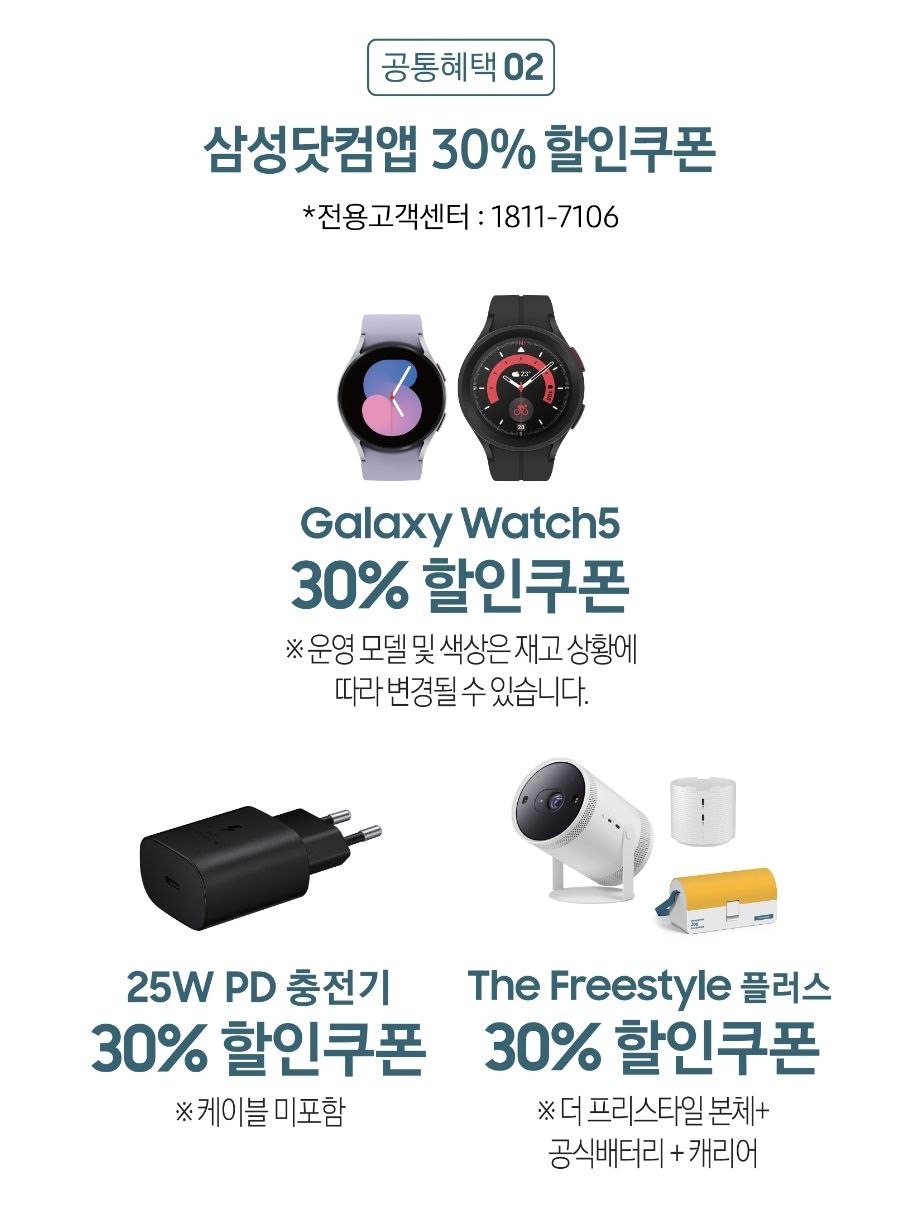 갤럭시 워치 5시리즈, 25W PD 충전기, 더 프리스타일 플러스의 제품을 대상으로 삼성닷컴에서 구매 시 사용가능한 30% 할인쿠폰을 준다고 합니다. 각각의 제품마다 쿠폰을 증정하는 것입니다.