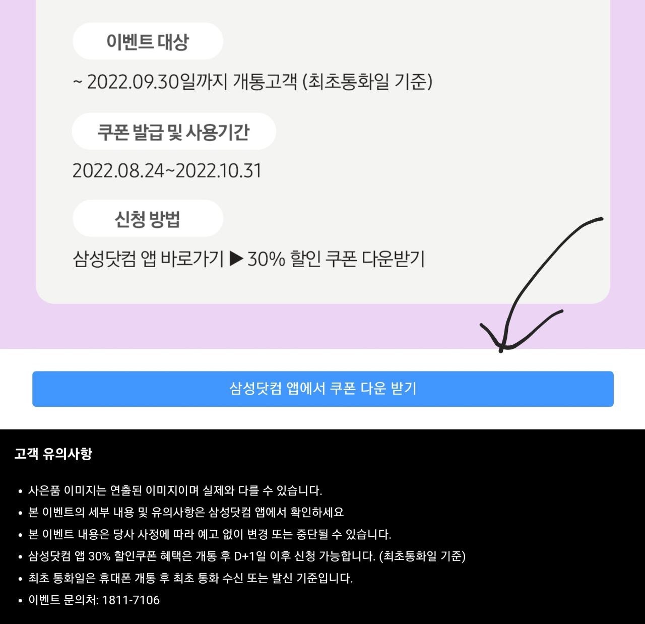 30% 특별할인 혜택은 2022년 9월 30일까지 최초 통화일 기준으로 개통한 고객을 대상으로 발급이 되며, 쿠폰 발급과 사용기간은 2022년 8월 24일부터 2022년 10월 31일까지라고 합니다. 1인당 각 제품에 1개씩, 1회 1개 구매에 적용되는 쿠폰이라고 합니다.