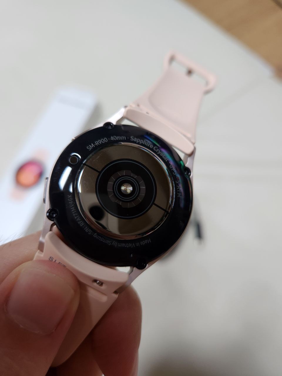 이렇게 갤럭시워치5 40mm 핑크골드 색상이 왔습니다. 스마트워치 종류는 이번이 처음이라 위 아래로 긴 포장이 신기했습니다. 앞면에선 시계의 모습이, 뒷면은 시리얼번호와 각종 안내문과 손목 스트랩의 길이를 간단하게 잴 수 있는 선도 있습니다.