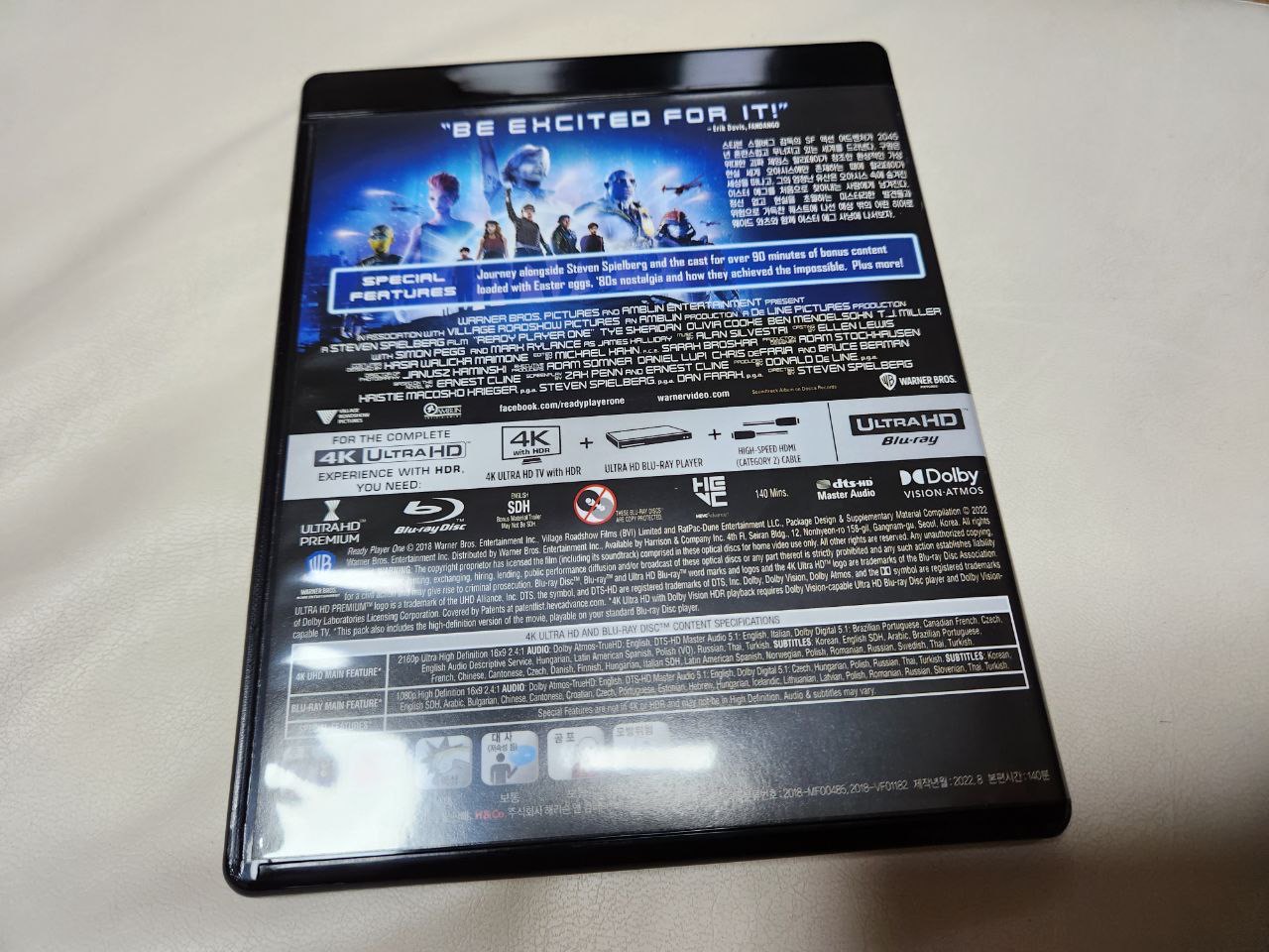 정식 개봉 당시에 용아맥에서 영화를 관람했었는데요, 오아시스 가상 공간의 파란색 계통의 색감과 아이언 자이언트와 오버워치 게임 캐릭터와 산리오 캐릭터들과 건담과 샤이닝, 메카고질라 등의 여러 작품들의 캐릭터가 짧게나마 한 작품 속에 총출동한 모습이 정말 인상적인 영화였습니다. 그런 영화가 이번에 4k 블루레이로 재출시가 되었다고 하니 이번 기회에 한 번 장만을 해봤습니다.