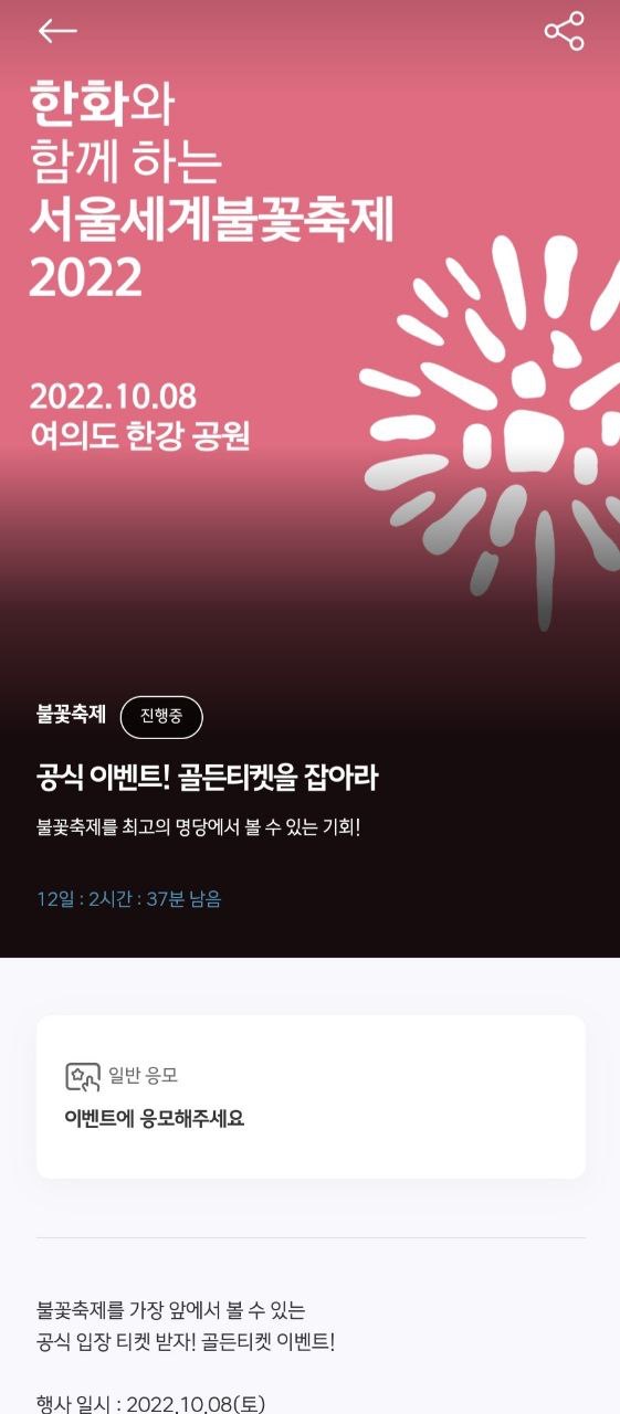 올해에도 한화에서 공식으로 지정한 명당좌석에서 불꽃축제를 관람할 수 있는 ‘골든티켓’이벤트가 진행됩니다. 이번엔 특이하게도 공식 홈페이지가 아닌 한화 라이프플러스 트라이브 앱을 통해서 응모가 가능합니다.