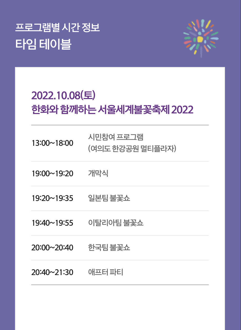 이번 서울세계불꽃축제에 관한 자세한 내용이나 정보는 공식 홈페이지 https://hanwhafireworks.com 를 통해서 확인하실 수 있습니다.반응형'정보' 카테고리의 다른 글