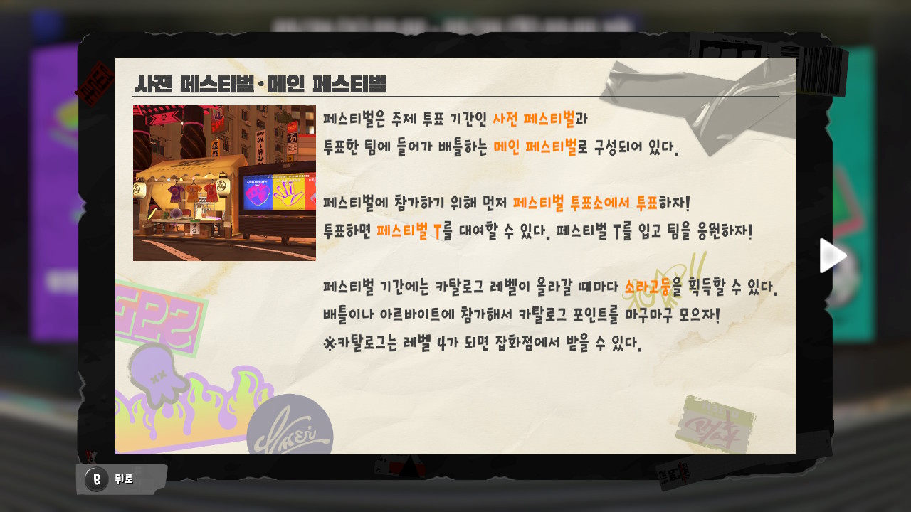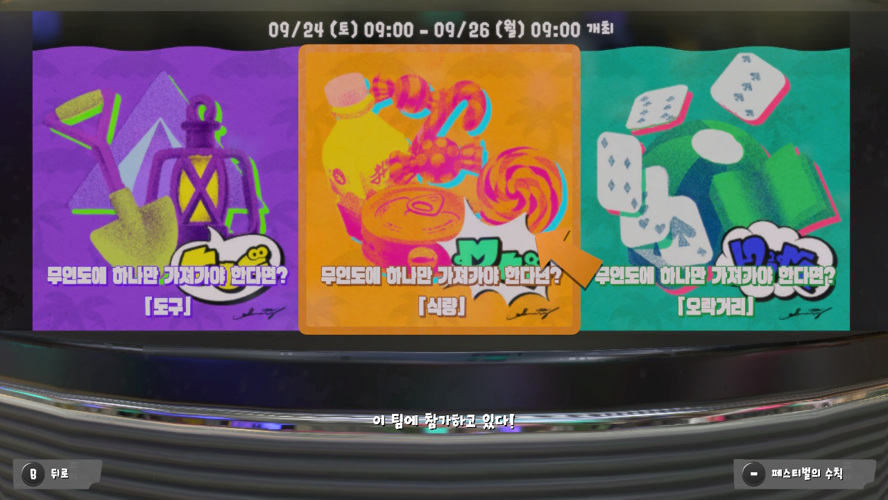 하지만 이번 스플래툰3에서는 페스 매치가 다르게 진행이 됩니다. 전작에서는 페스 매치 기간이 시작이 되어서야 진영을 고를 수 있었지만, 이번작품은 페스 매치 기간 이전부터 진영을 고를 수 있습니다.