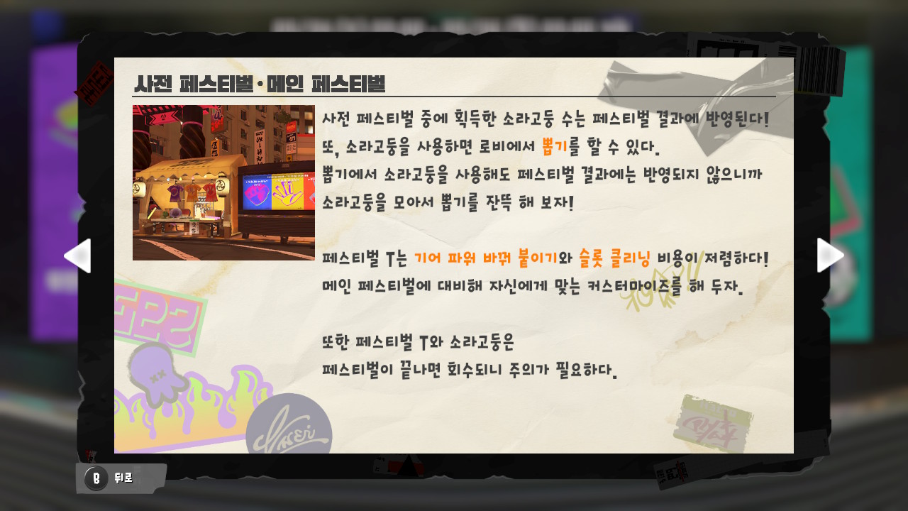 페스티벌 기간에 참가하면 슈퍼소라를 얻을 수 있는데 승리한 팀이 좀 더 많은 슈퍼소라를 획득할 수 있습니다. 그리고 페스티벌 기간에만 입을 수있는 페스티벌티라는 의상이 지급되는데 기어를 붙이거나 완전히 기어의 슬롯을 클리닝하는 비용이 저렴합니다. 그리고 페스 기간동안엔 카탈로그 레벨이 더 빨리 상승한다고도 하니 스플래툰3를 하시는 분들은 꼭 페스 매치에 열심히 참여하셨으면 좋겠습니다.