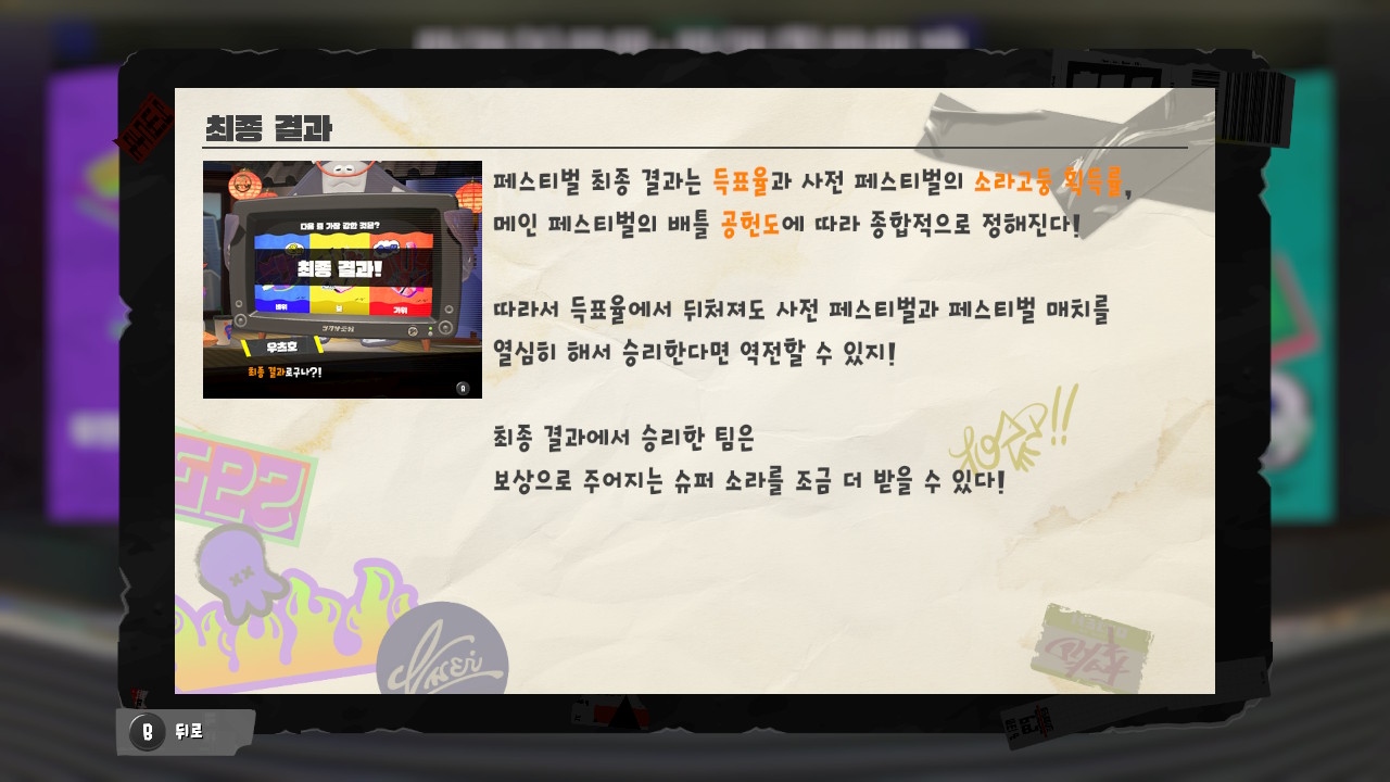 어떤 팀이 더 많은 사람들이 선택했는지(투표율)와 각 진영의 사람들이 얼마나 잘 싸워줬는가(공헌도) 두 가지 밖에 없었지만 이번 스플래툰3에선 사전 페스티벌 기간동안의 소라고둥 획득률 또한 반영이 됩니다.