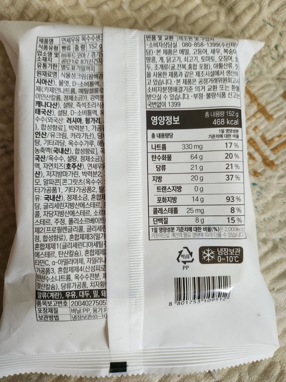 468칼로리, 기존 메론맛은 467칼로리였는데 1칼로리 차이로 연세우유 생크림빵시리즈 중에서 가장 칼로리가 높은 맛입니다. 열량이 신경쓰이는 분은 참고하시기 바랍니다.