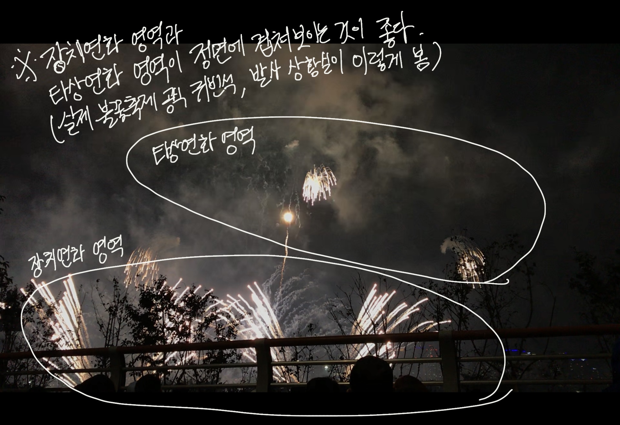 두 눈으로 볼 때도, 카메라 동영상으로 촬영할 때도 좋지가 않겠죠. 그래서 되도록 불꽃 연출은 정면에서 보는 것이 좋습니다.