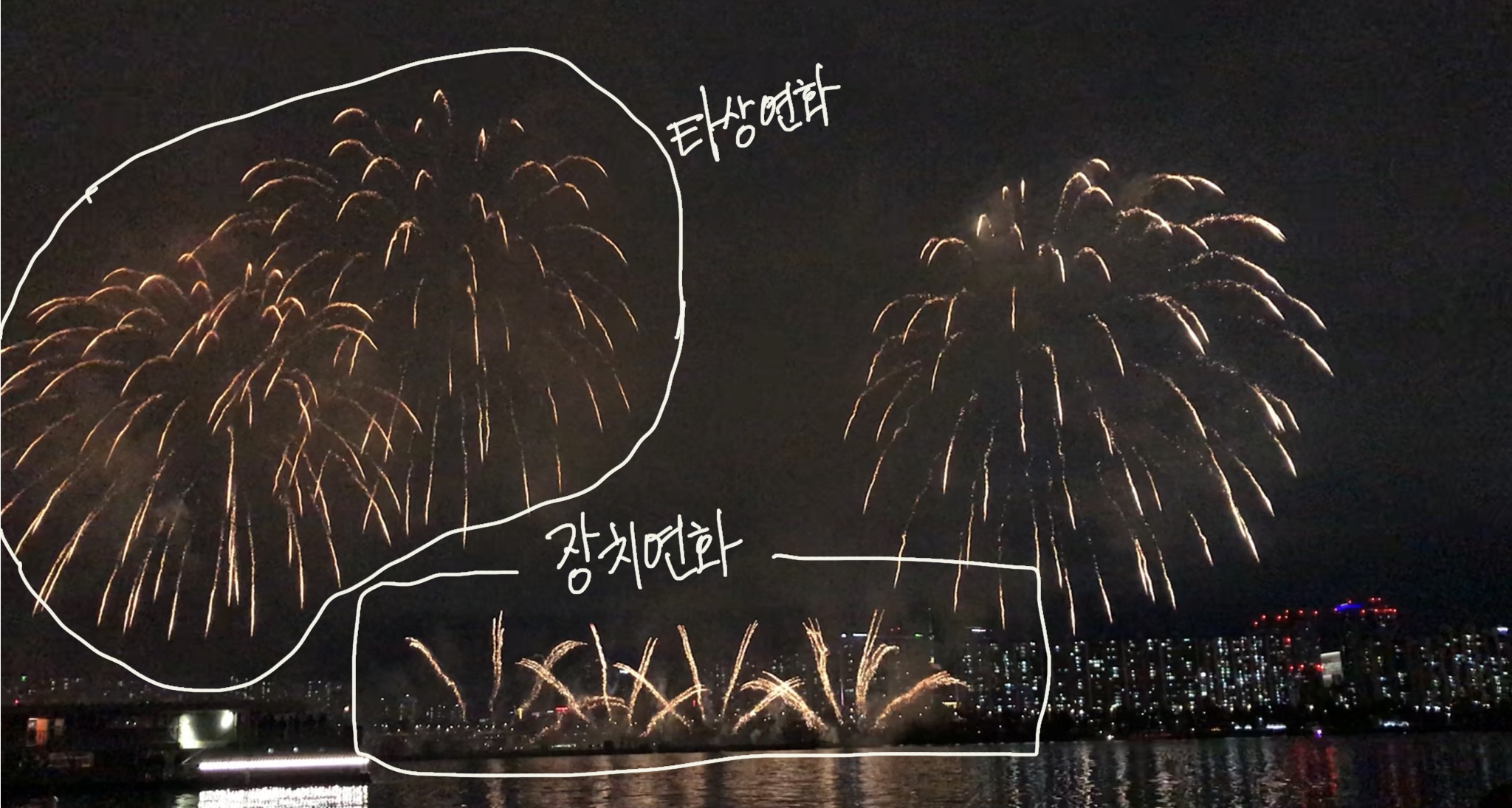 가장 먼저 빛은 바로 불꽃의 빛입니다. 불꽃축제에서, 또는 불꽃쇼에서 볼 수 있는 불꽃은 크게 두 가지 종류로 나뉩니다. 바로‘타상연화’와 ‘장치연화’로 나뉩니다.
