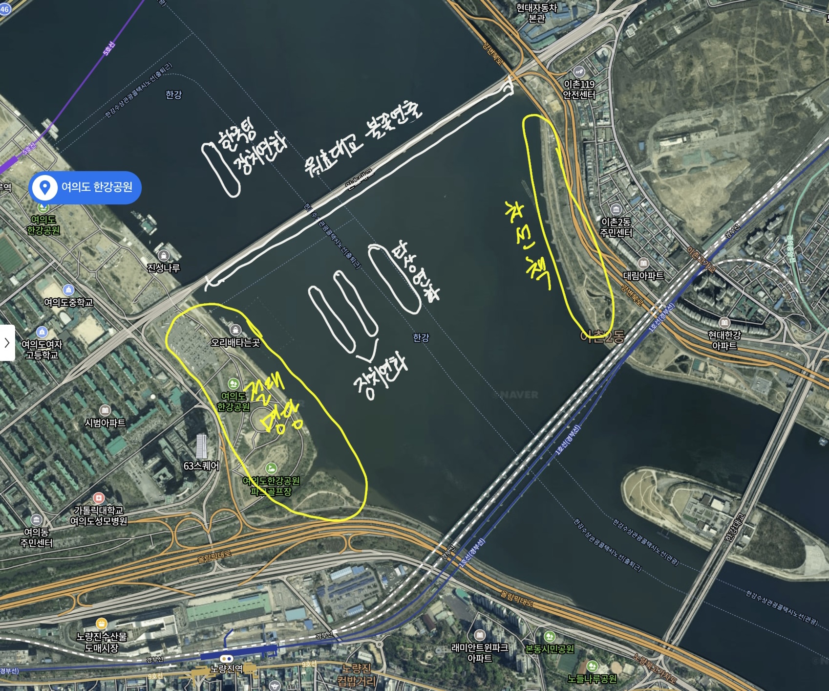 차선책 이외의 장소 외에 더 넓은 범위는 대체로 원효대교~한강철교 사이의 공간이 최적의 장소입니다. 모든 장치연화를 볼 수있는 곳이고 이보다 더 먼 곳은 타상연화밖에 못보게 됩니다.