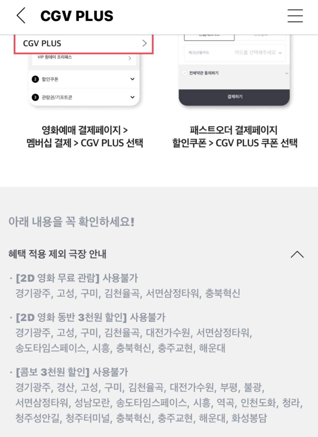 일단은 일부 위탁관을 위주로 CGV플러스의 무료 관람 및 동반 1인 할인 혜택이 적용이 불가한 점,