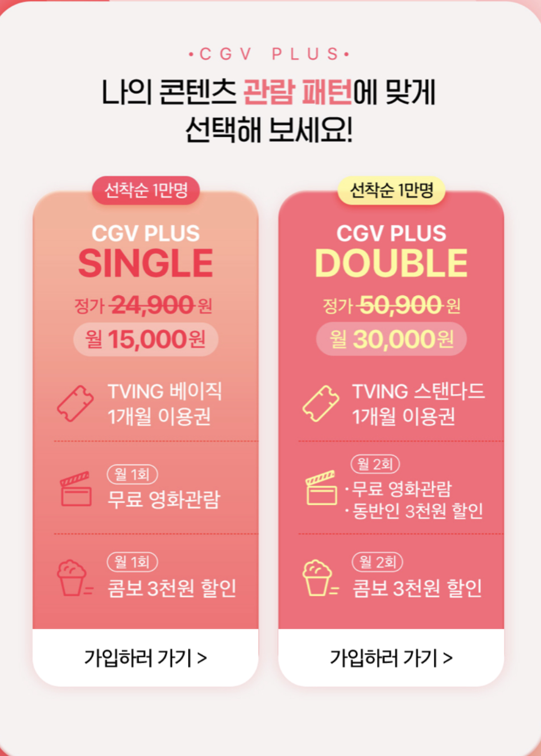 기본적으로 TVING의 요금제를 구독하고 거기에 추가적으로 비용을 낸 만큼 서비스로 CGV의 할인 혜택을 주는 개념으로 이해하시면 편할겁니다. 티빙 요금제를 좀 더 웃돈주고 샀더니 CGV의 영화관람권과 콤보 할인권이 같이 왔다는 식입니다. 문제는 이 경우 CGV에서의 영화 관람은 유료 결제 관람이 아닌 무료 관람이 되어 CGV를 통한 CJ ONE 포인트 적립이 되지 않습니다. 혹시라도 CGV의 VIP등급 관리에 신경을 쓰신다면이 CGV플러스는 전혀 도움이 되지 않습니다.