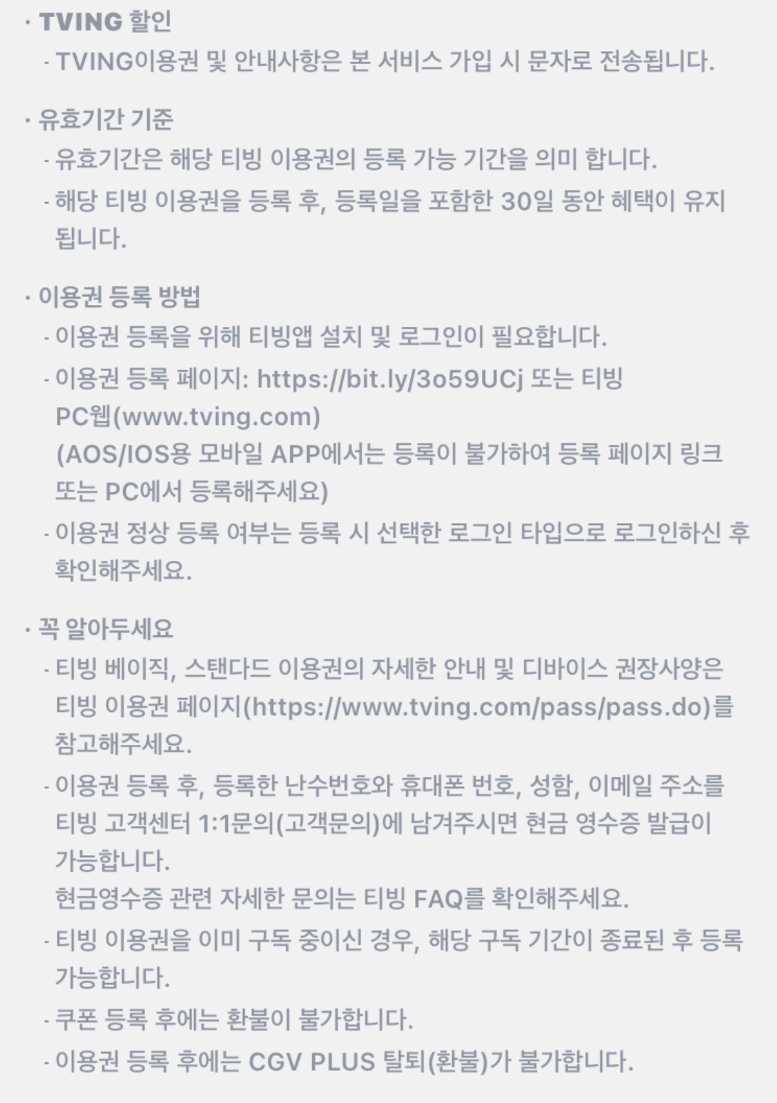 티빙을 통해 OTT 서비스를 즐기면서 CGV를 자주 가시는 분들에겐 솔깃한 서비스라고 생각이 듭니다만, 개인적으로 약관을 보고서 제가 기대했던 것과는 꽤 다른 서비스라는걸 깨달았습니다.