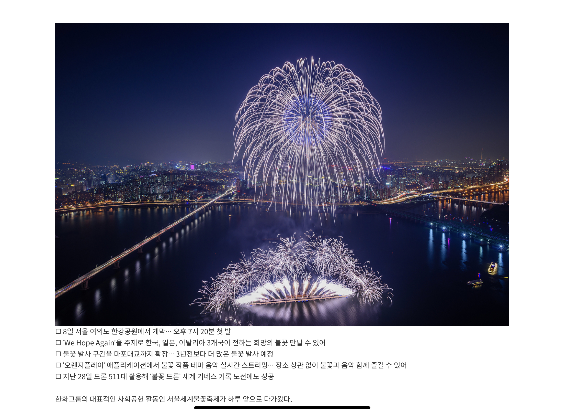 일단 하루 전인 어제 금요일엔 한화에서 공식 보도자료를 냈는데요, 불꽃축제를 앞두고 이 보도자료를 보며 행사를 보러 가기 전 한 번 마지막으로 정리를 해보고자 이 글을 작성해봅니다.