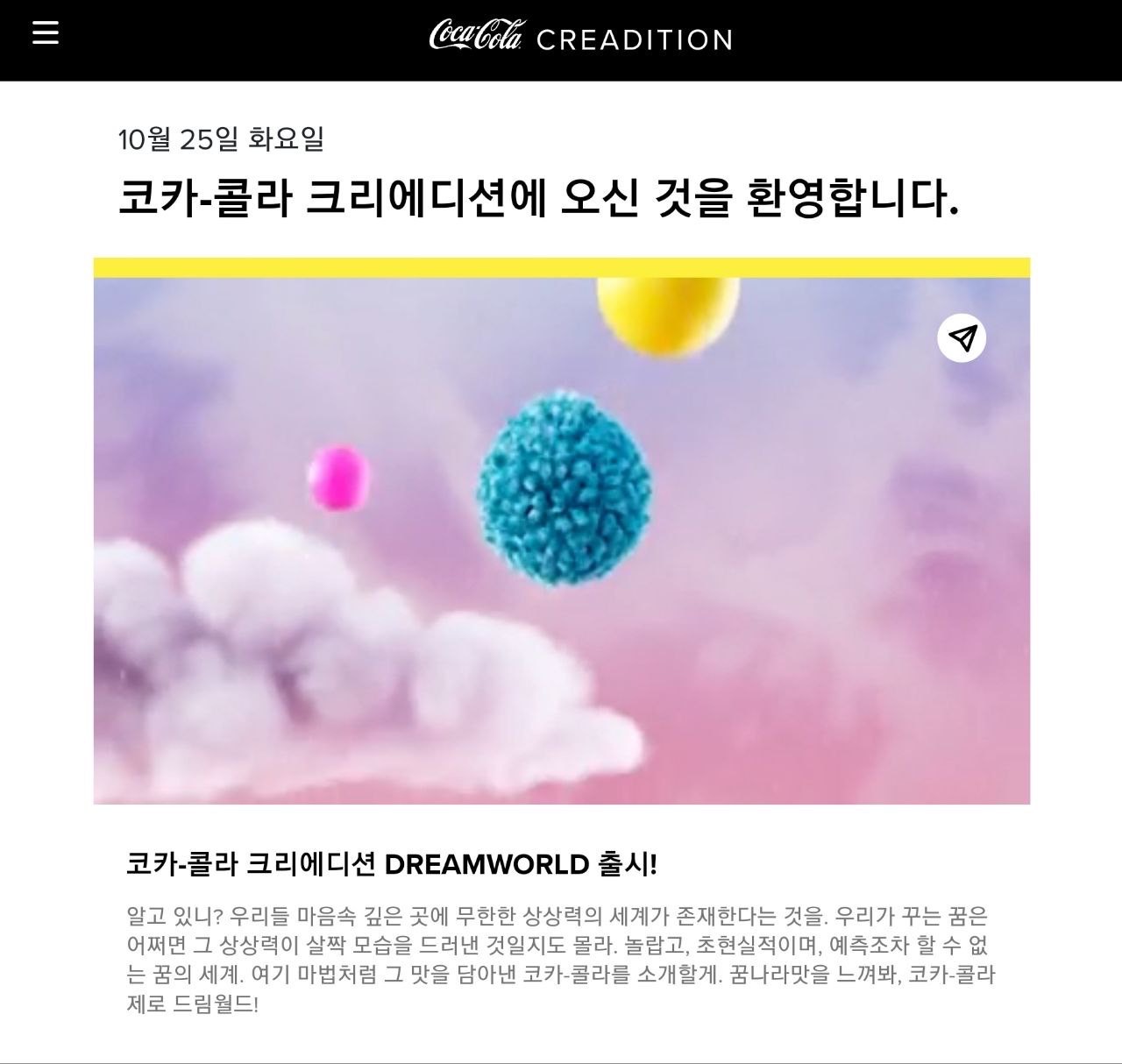 음료 캔 가운데에 QR코드가 있어서 무엇인가 하고 인식을 해봤더니 코카콜라 크리에디션 홈페이지가 나옵니다.