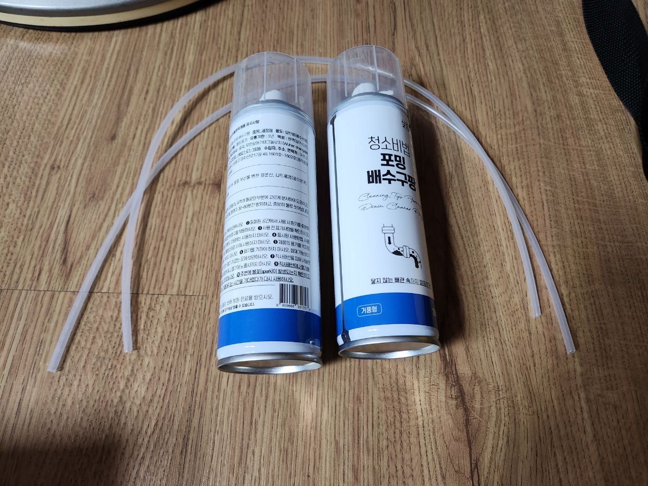 구매한 제품은 살림고수에서 나온 청소비법 포밍 배수구팡. 2개를 구매했는데 스프레이 2캔과 얇고 긴 플라스틱 튜브 2개가 같이 왔습니다. 아마도 배수구 깊은 곳으로 거품을 쏘기 위함이겠지요.
