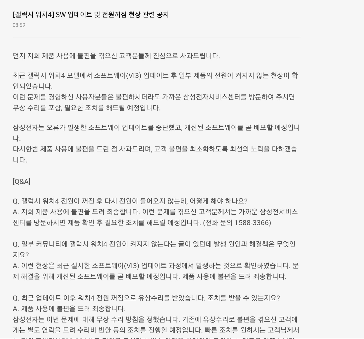 추가로 전원이 켜지지 않는 제품에 대해서 가까운 삼성전자서비스센터를 방문하면 무상으로 수리를 한다고 합니다. 기존에 유상 수리를 하신 분이라면 별도 연락을 통해 수리비 반환 조치를 진행할 예정이라고 합니다. 더 빠른 조치를 원한다면 콜센터 1588-3366을 통해 서비스 이력을 확인 후 조치를 할 수 있도록 한다고 합니다.