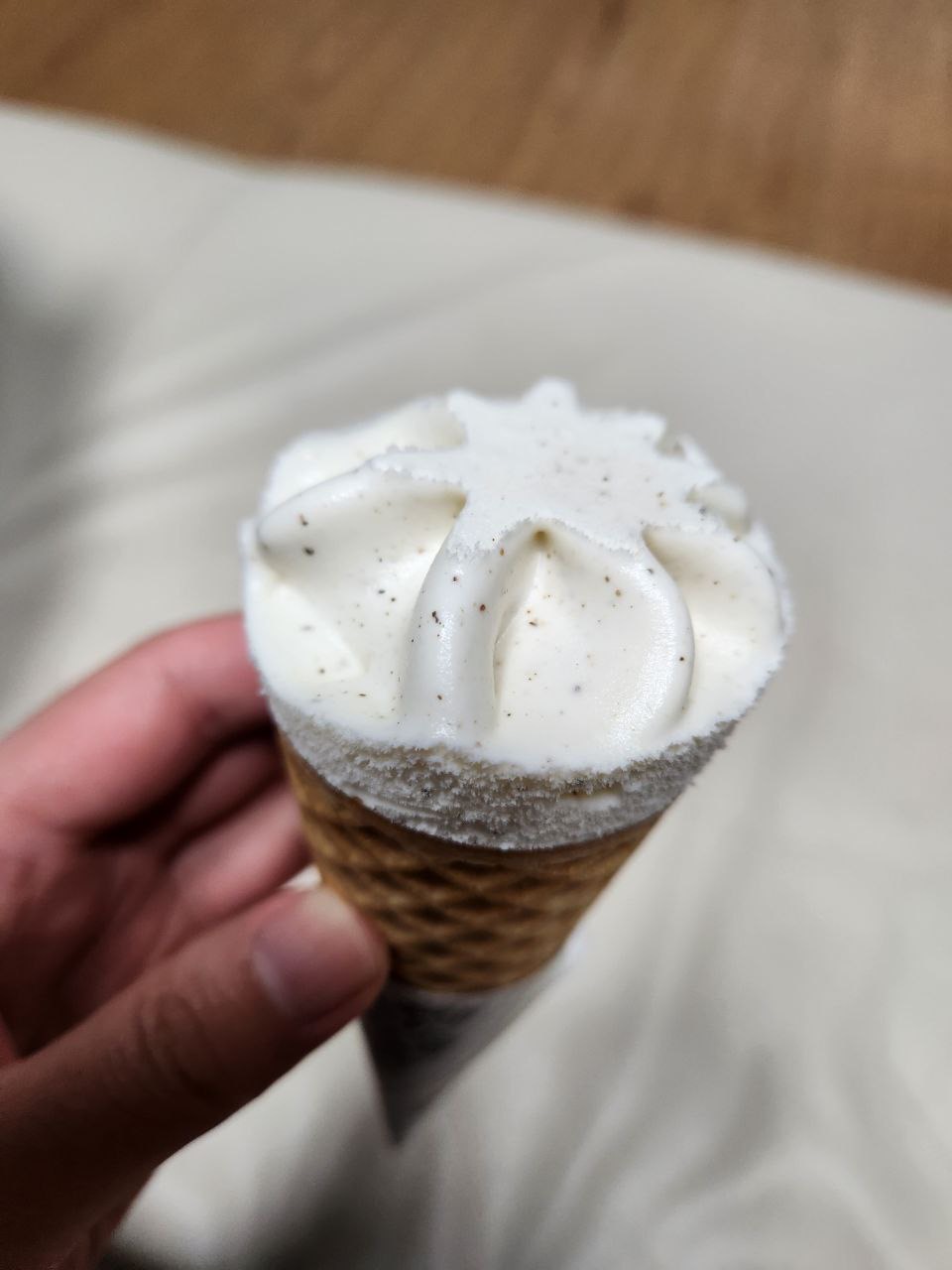 하얀 아이스크림에 점처럼 보이는 게 후추들입니다. 이렇게 후추가 조금씩 함유되어 있는 것을 알 수 있습니다. 생긴 것은 무언가 월드콘처럼 생겼는데 실제로 기본적으로 월드콘 바닐라 맛과 유사합니다. 거기에 약간의 후추가 뿌려져서 후추 향이 드문드문 조금 강하게 느껴지는 것입니다.