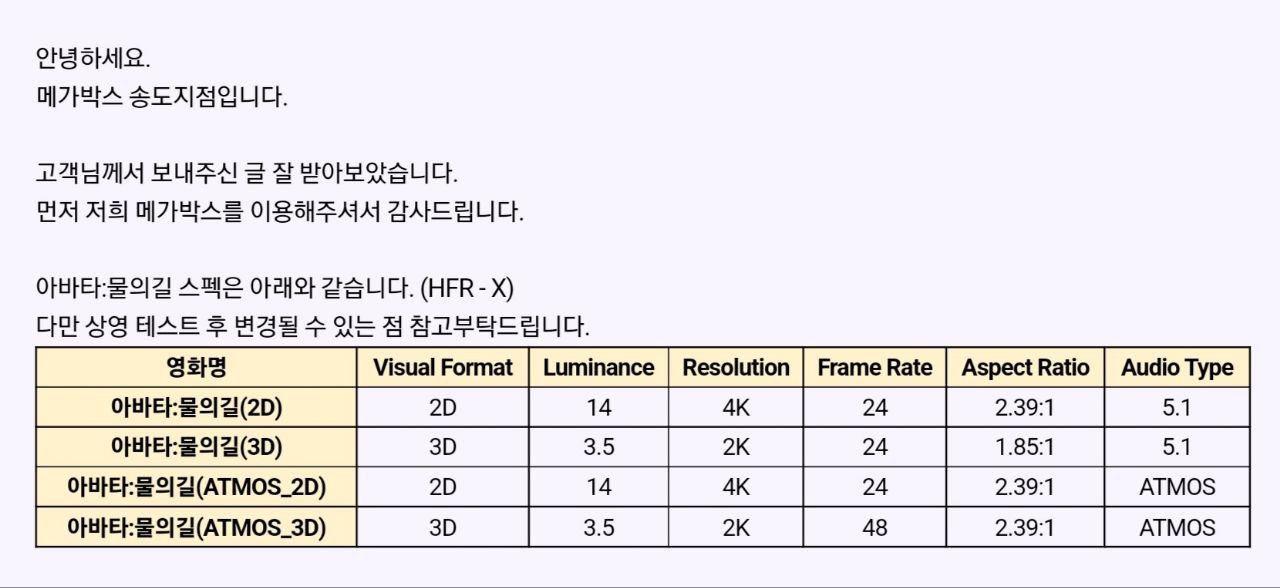 최종 상영 포맷이 변경 될 수 있기 때문입니다.아무튼 이렇게 현재까지 밝혀진 정보를 토대로 아바타 물의 길 상영 스펙을 나름대로 정리해봤습니다.