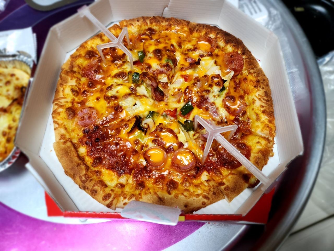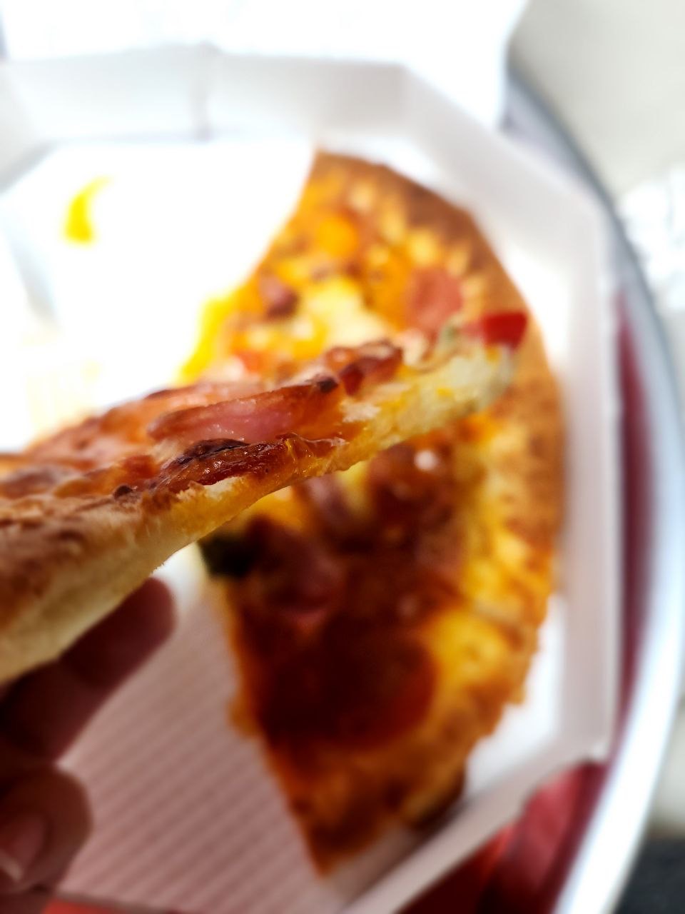 도우가 상당히 얇은 편입니다. 그렇다보니 피자 레귤러 사이즈를 먹으면 완전히 배가 부르기보단 든든하게 배가 찬다는 느낌입니다. 다른 블로그에선 피자를 돌돌 말아서 먹는다고도 하더군요.