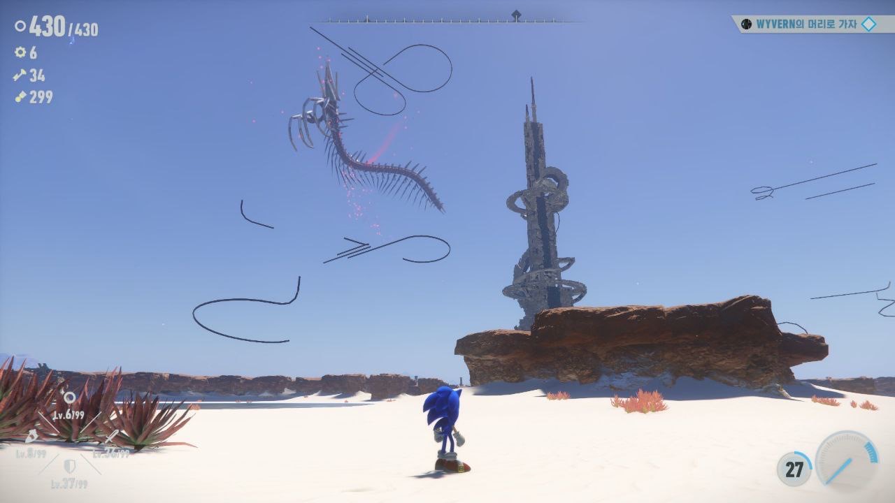 우리가 흔히 알고 있는 소닉은 정해진 트랙을 빠르게 질주하는 소닉으로 기억하고 있습니다. 그래서 이번 작품처럼 ‘완전한 오픈월드와 소닉의 궁합이 잘 맞을까?’하는 궁금증이 들었습니다. 제가 느낀 점은 ‘일단 나쁘진 않다.’ 였습니다. 빠르게 달리는 소닉과 광활한 필드가 잘 어울립니다. 사막, 설원, 초원 등 다양한 자연 풍경이 펼쳐져서 달리면서 배경으로 펼쳐지는 풍경을 바라보는 점은 좋았습니다. 전통적인 소닉 시리즈의 트랙은 필드상의 전뇌공간으로 되어 있습니다. 이전 소닉 게임을 할 때 스테이지를옮기는 것이 오픈월드에서 움직이는 것처럼 느껴졌습니다. 빠르게 움직이면서 중간중간 곳곳에 있는 수수께끼들을 풀고, 코코들을 찾고, 중간 보스격의 적들을 다양한 기믹에 맞게 처치하는 맛도 있습니다.