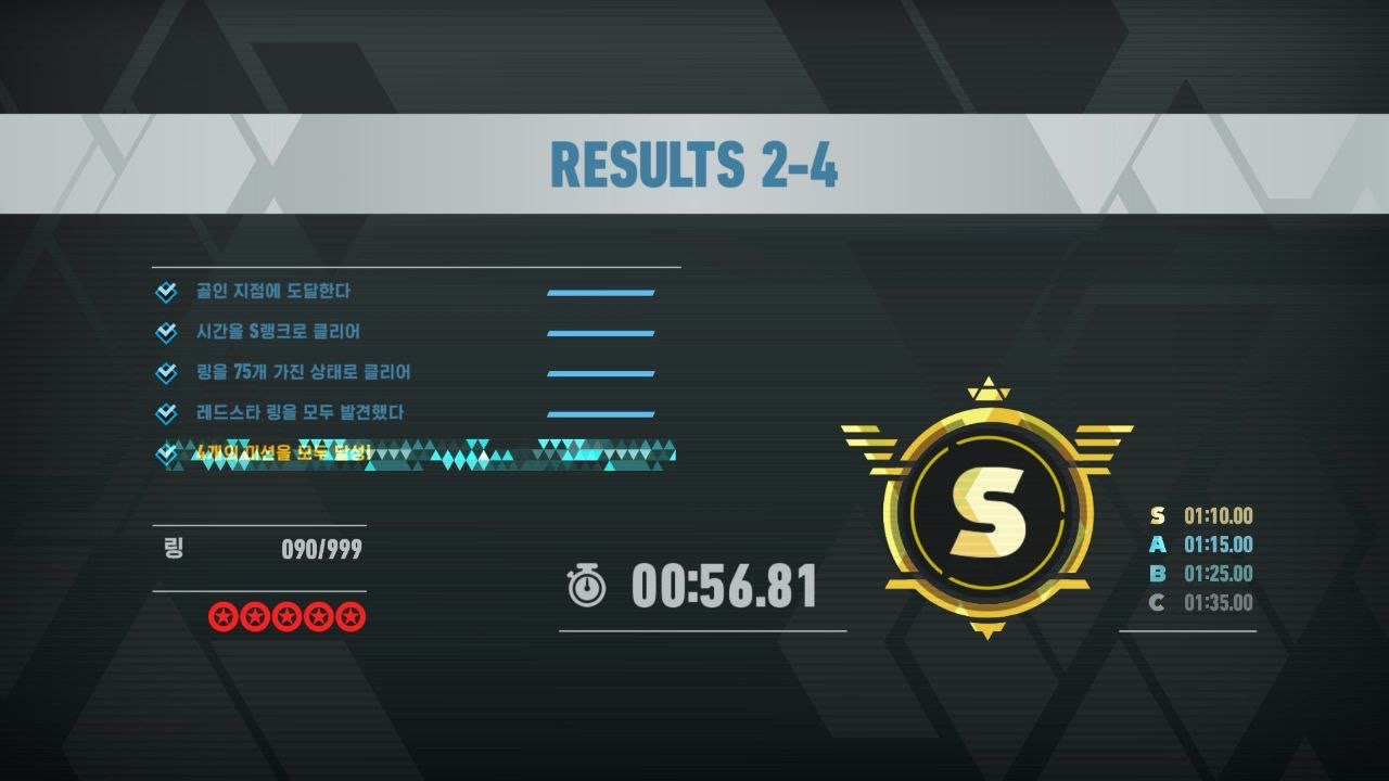 여러 클리어 조건이 있는데 각 조건별로 클리어 조건을 만족하면 1개씩 열쇠를 주고, 그 전뇌공간의 클리어 조건 4개를 모두 만족하면 추가로 열쇠 3개를 더 줍니다. 전뇌공간은 위에서도 언급했듯 전통적인 소닉시리즈처럼 트랙을 달려 완주를 하는 공간입니다. 클리어 조건으로 일단은 완주하기 / 각 스테이지별로 S급 완주 시간 기록을 세우기 / 링을 일정 갯수 보유한 채로 완주하기/ 중간에 있는 레드스타 링을 모두 먹어서 획득하기 등이 있습니다.