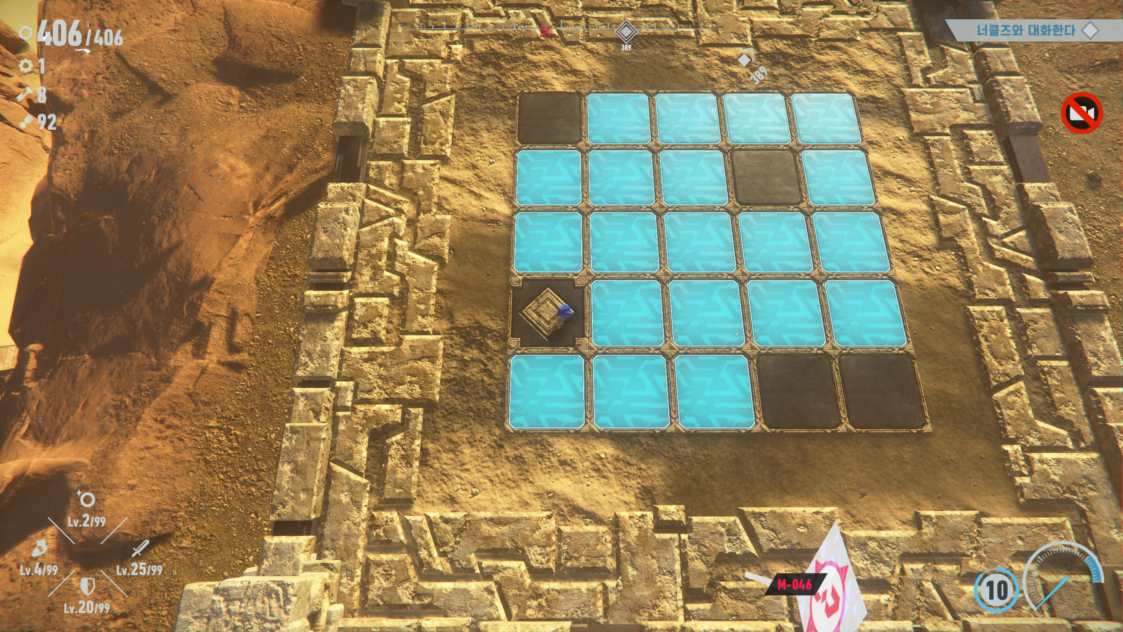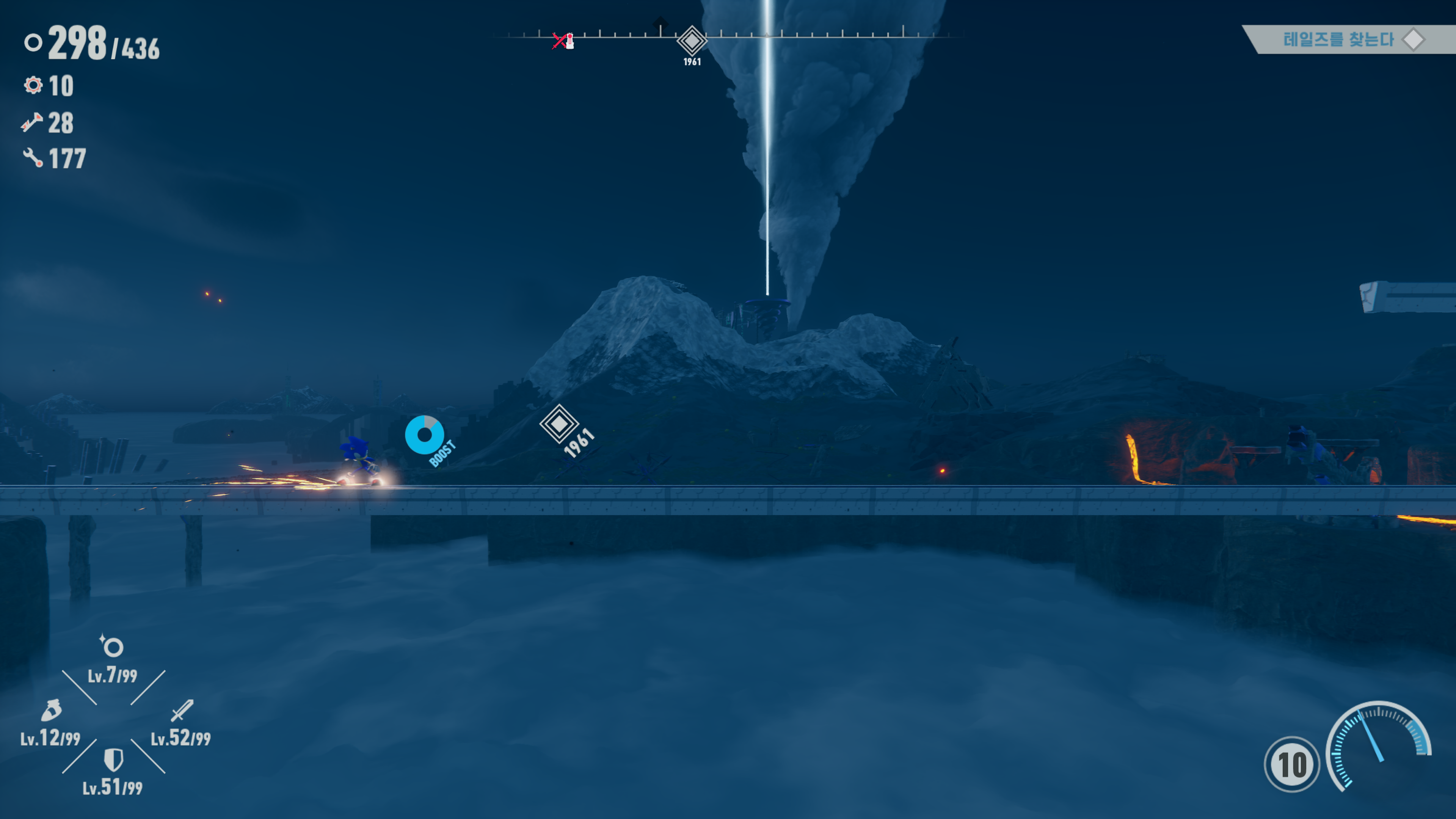 단점 첫 번째로는 오픈월드이지만 ‘빠른 이동’이 불가능하다입니다. 다른 오픈월드 게임들 같은 경우는 중간마다 체크포인트 형식으로 미니맵을 열고 특정 지점을 선택해서 빠르게 그 지점으로 갈 수 있는 빠른 이동 기능이 있지만 소닉 프론티어에선 그런게없습니다. (정확하게는 총 2,3군데에 있는 특정 NPC에게 빠르게 가기가 있지만 해금을 해야 합니다.) 맵 곳곳에 있는 수수께끼를 클리어해서 하얀 레일을 만들고 소닉이 직접 이동을 해야 합니다.