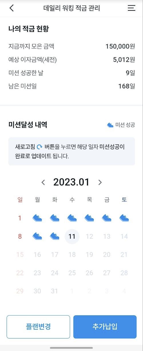이 적금의 가장 핵심은 ‘매일 만 보 걷기’입니다. 그런데 이 만 걸음을 매일 걷는게 쉽지가 않습니다. 이 경우 실패를 하게 되는데 만약 실패하게 되면 그냥 이자 11%가 날아가는게 아닌가 하는 걱정을 하실겁니다. 결론부터 말하자면 ‘꼭 그렇지 않다.’입니다.