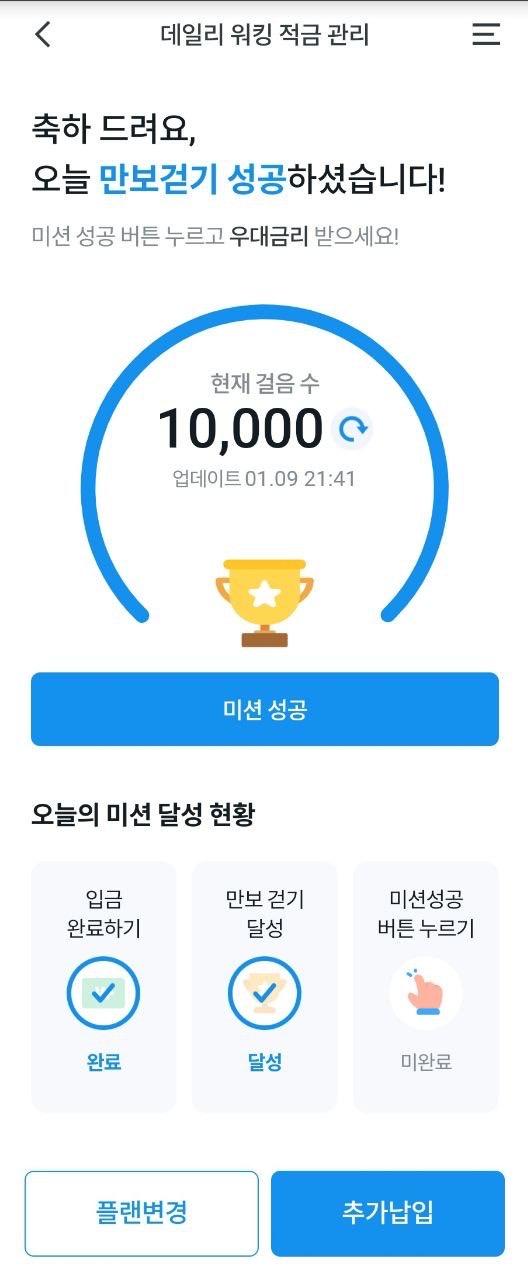 적금은 매일 1만원씩 자동 입금이 되고, 180일동안 유지되는 상품입니다. 11%의 이자를 얻기 위해선 매일 1만 보 이상을 걸어야 합니다. 1만 보 이상을 걷고 나서 반드시 미션 성공 버튼을 터치해야 합니다. 기본 이자는 1%이고 만 보 이상을 걸어야 우대금리 10%가 추가되어 최대 11%의 이자가 지급되는 겁니다.