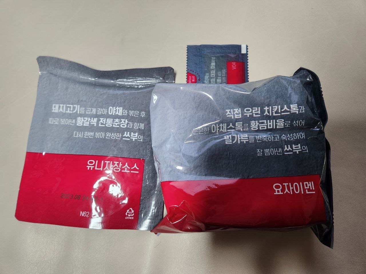 라면, 스프, 기름 이렇게 있습니다. 요자이멘이 라면이고, 유니자장소스가 말 그대로 소스입니다. 돼지고기를 곱게 갈고 야채와 같이 볶고 전통 춘장을 함께 또 볶고 그랬다고 합니다.