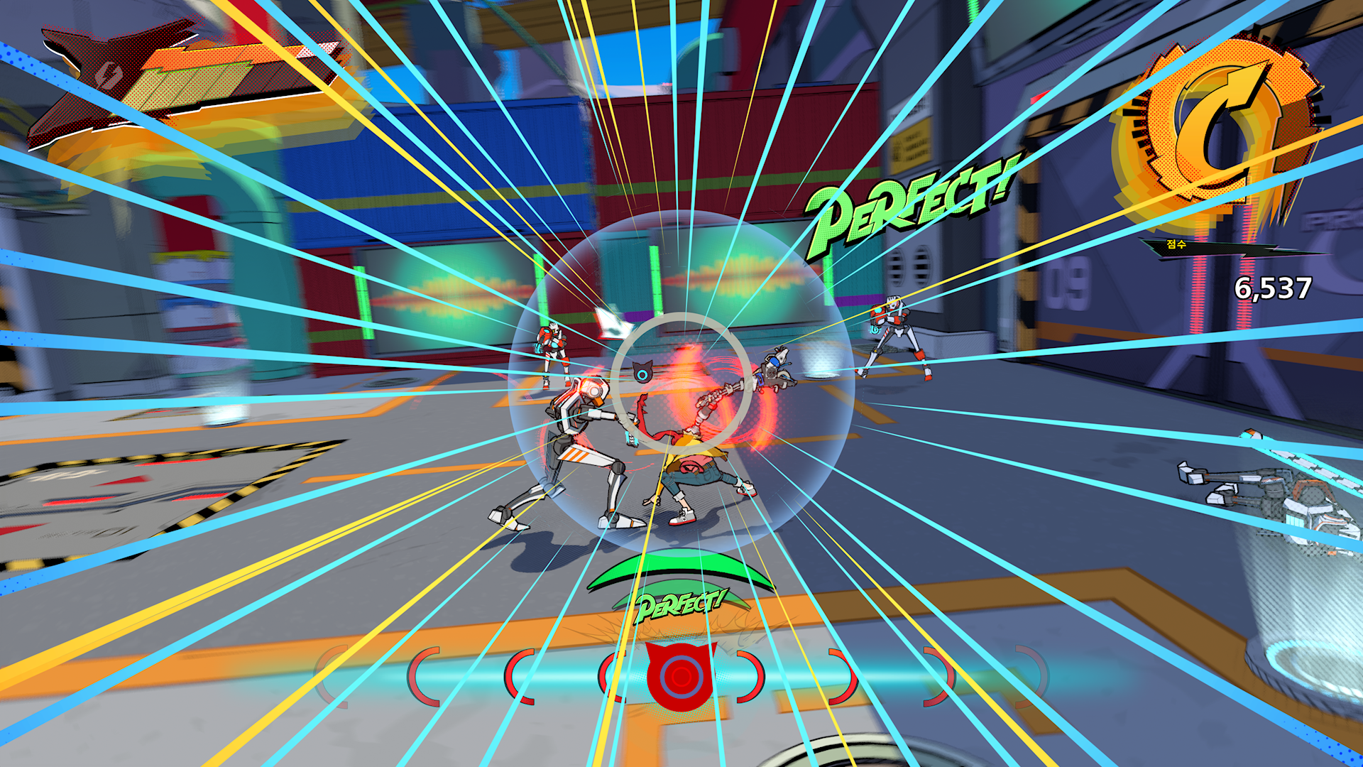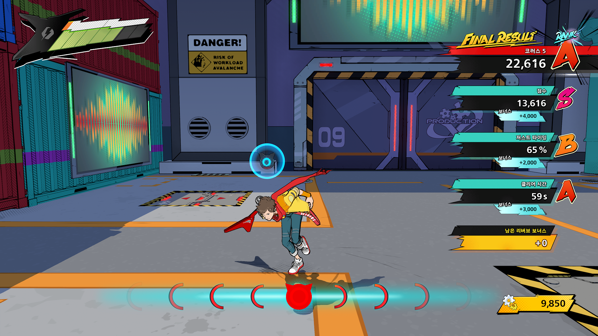 액션 역시 상당히 인상적이었습니다. 기본적으로 약공격 강공격 버튼을 이용해 박자에 맞춰 연타를 하거나 한 번 쉬었다 연타를 하는 식 등등 다양한 방식으로 콤보와 기술이 존재합니다. 판정 역시 후하게 주는 편이라 전투와 박자 맞추는 것에 너무 큰 부담을 갖지 않으셔도 됩니다.전투가 진행되면 우측 위해 알파벳으로 랭크가 뜨고, 전투가 종료되면 해당 전투에 대한 평가 점수가 주어집니다. 점수와 저스트 타이밍(정확한 타이밍에 원을 겹쳐 공격하는 것), 클리어 시간, 그리고 필살기와 연관된 남은 리버브 등 여러 요소로 점수를 책정합니다.