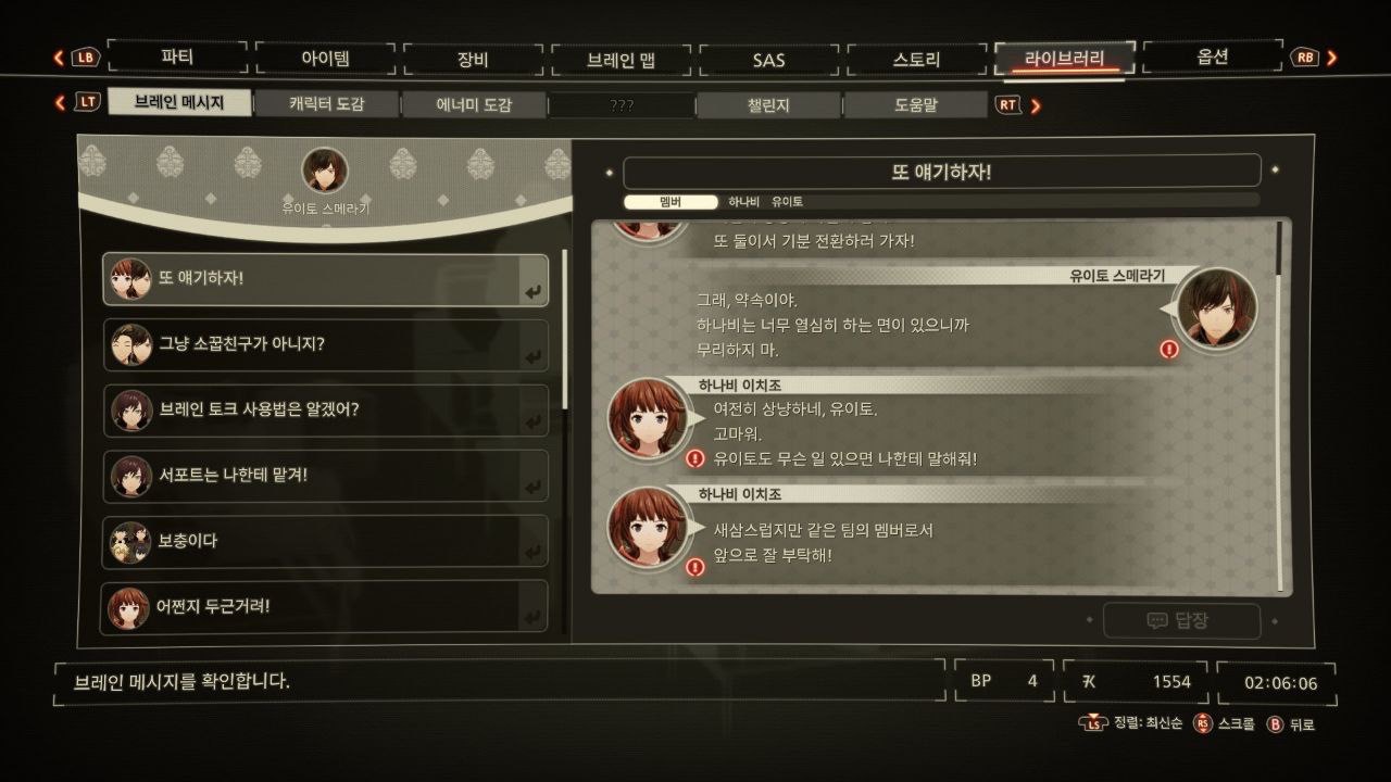 메인스토리가 진행되는 ‘페이즈’ - 아지트에서 쉬면서 재정비와 유대 에피소드를 진행하는 ‘스탠바이 페이즈‘를 번갈아가며 게임이 진행이 됩니다. 스탠바이 페이즈에서 동료들과 유대 에피소드를 쌓는데 주인공을 제외하면 후반부엔 동료가 총 9명이 됩니다. 즉, 화려한 전투가 펼쳐진 이후에 각각의 동료들과 유대 에피소드를 최대 9번이나 진행을 해야 합니다. 보통은 페이즈 한 번 진행하는데 최대 2시간 내외의 시간이 소비되는데동료들의 유대 에피소드를 진행하면 기본적으로 1시간이 훌쩍 넘어가게 됩니다. 시간 소비가 상당히 큽니다. 유대감을 높이기 위해선 유대 에피소드를 진행하는 것 외에도 게임 중간마다 얻은 아이템을 통해 선물로 제작하여 특정 캐릭터에게 선물을 주는 방식도 있습니다. 문제는 지금 캐릭터들간의 유대감이 어느 정도 수준인지 표시되는 것이 전혀 없습니다. 유대 에피소드를 진행하는 것 외에 선물을 어떻게, 얼마나 줘야 하는지를 계산할 수 없다는 뜻입니다.