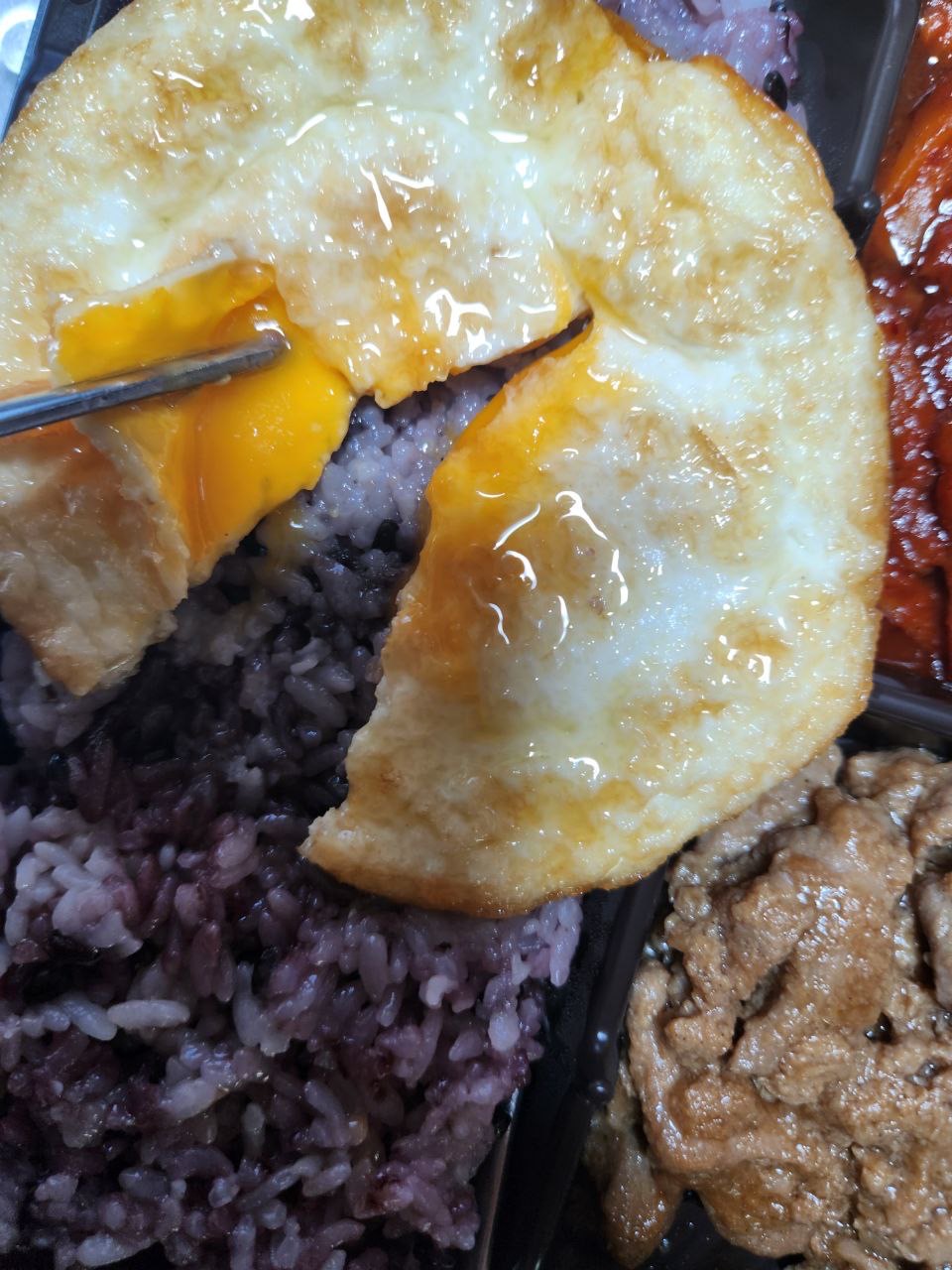 그리고 계란후라이는 반숙입니다. 계란을 가르니 노른자가 나옵니다.