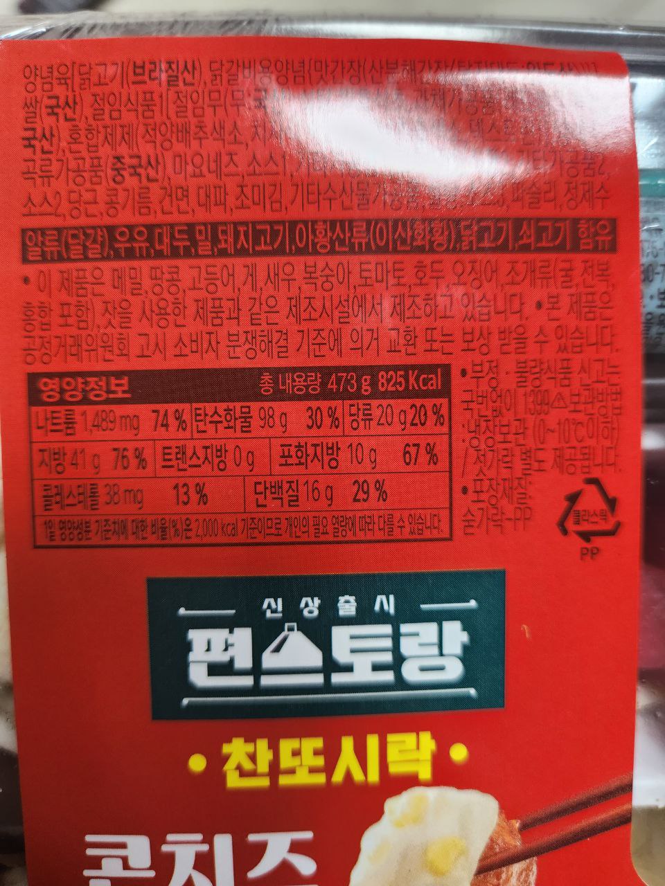 가격은 5500원입니다. 제가 먹은 편의점도시락들과 비교하면 약간 가격대가 높은 편이라 할 수 있겠습니다. 내용량은 473g이며 열량은 825칼로리입니다. 꽤 높은 편입니다.