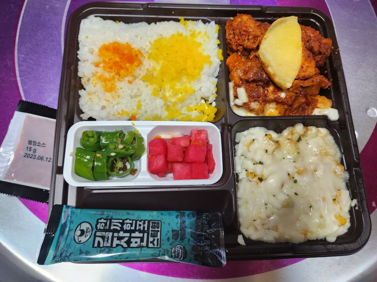 전체적인 구성은 날치알밥, 고추, 단무지, 콘치즈마카로니, 닭갈비가 있으며 특이하게도 김자반과 쌈장소스가 있습니다. 김자반은 날치알밥에 뿌려 먹었고 쌈장 소스의 경우는 닭갈비에 뿌려 먹어도 되고 따로 덜은 다음에 닭갈비를 쌈장에 찍어 먹는 방식으로도 드셔도 됩니다.