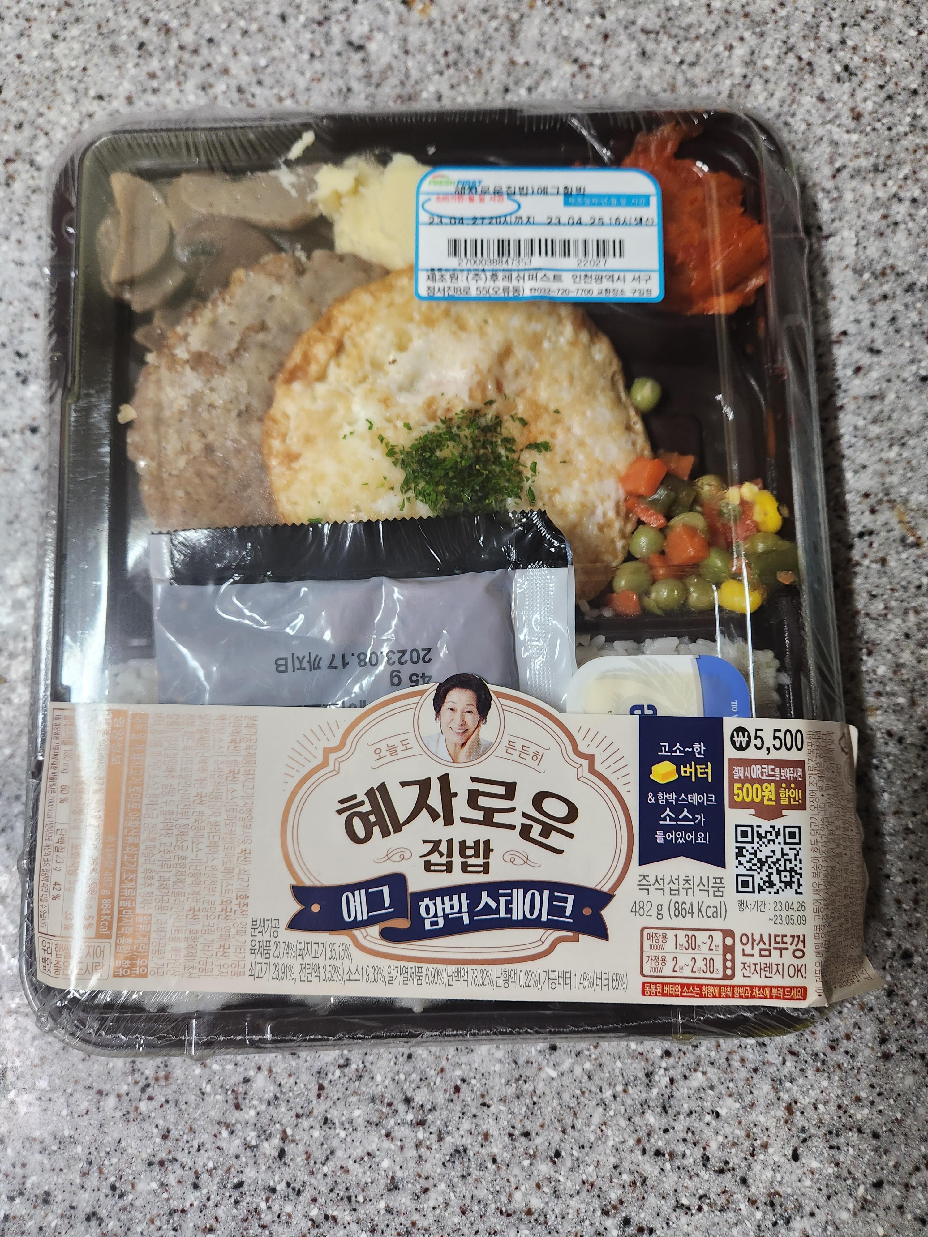 그러던 중에 바로 어제 4월 26일에 GS25에서 김혜자도시락, 혜자로운 집밥 시리즈의 4번째 상품인 에그함박스테이크가 정식 출시가 되었습니다. 현재 시점에서 제가 가장 선호하는 편의점 도시락 시리즈인 혜자로운 집밥 시리즈의 신상품인 만큼 꼭 먹어봐야겠다는 생각이 들었고, 집 앞 편의점에서 판매되는 것을 구매해서 먹어봤습니다.