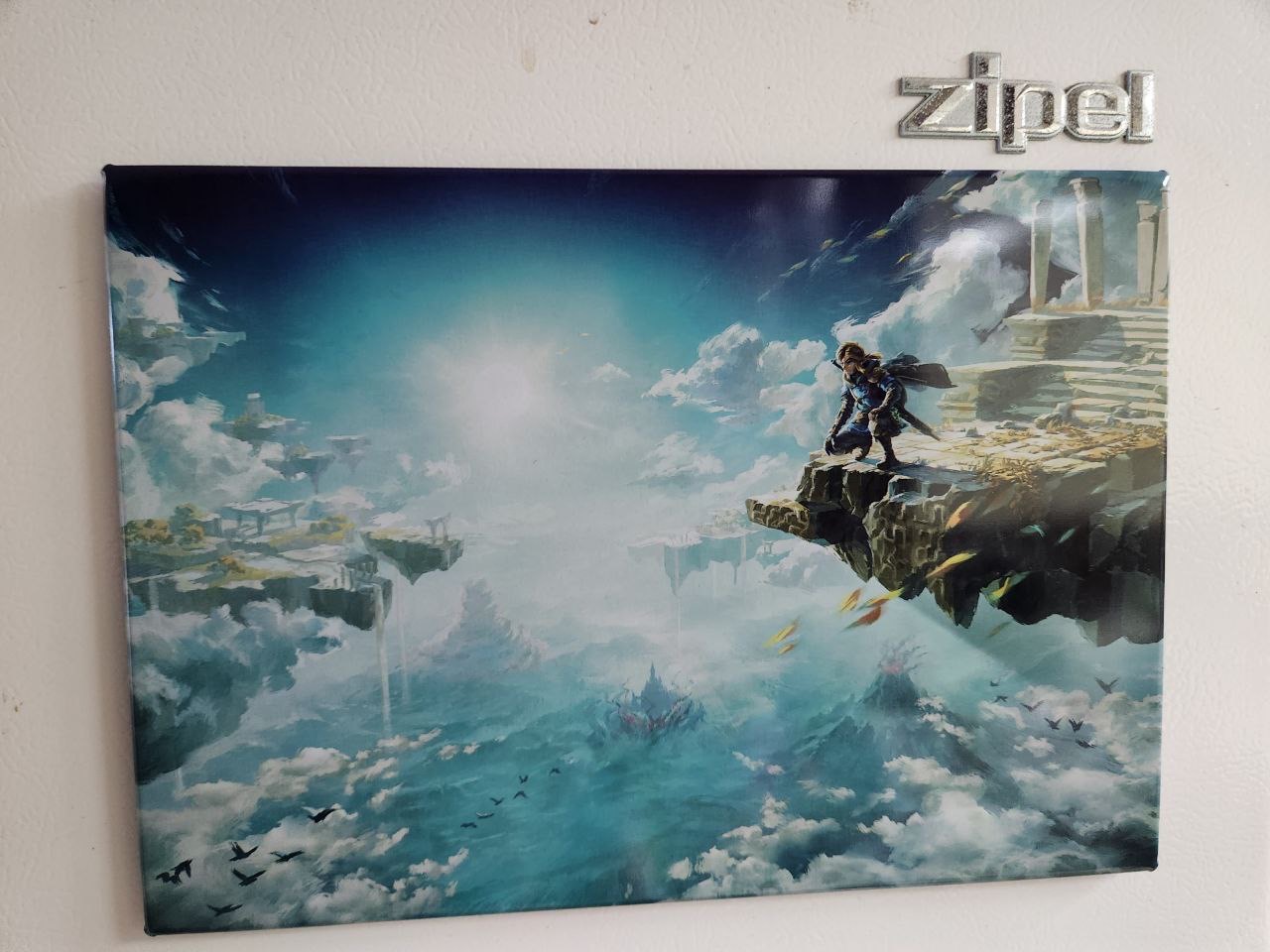 금속 판에 링크의 모습과 이번 젤다 시리즈의 주 무대가 될 하늘섬의 풍경이 그려져 있습니다.
