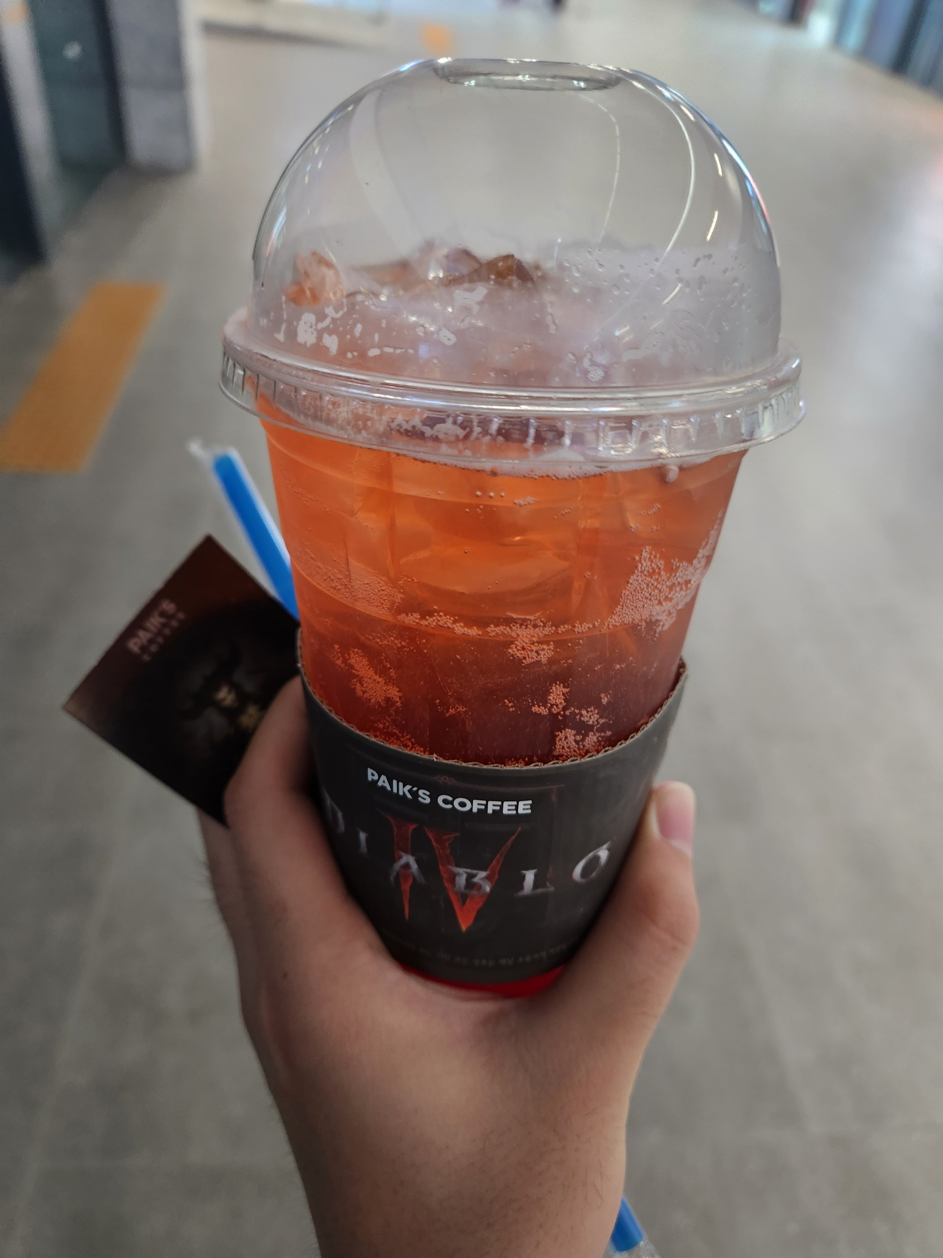 특히 그 중에서 가장 인상적인 것은 평소에 게임 마니아인 백종원 역시 디아블로4 콜라보를 진행한 것이지요. 바로 빽다방에서 디아블로 에너지드링크 메뉴를 출시했습니다. 정식 메뉴 이름은 디아블로 에너지드링크이지만 속칭 ‘빨간물약’이라는 이름이 더 유명하더군요.