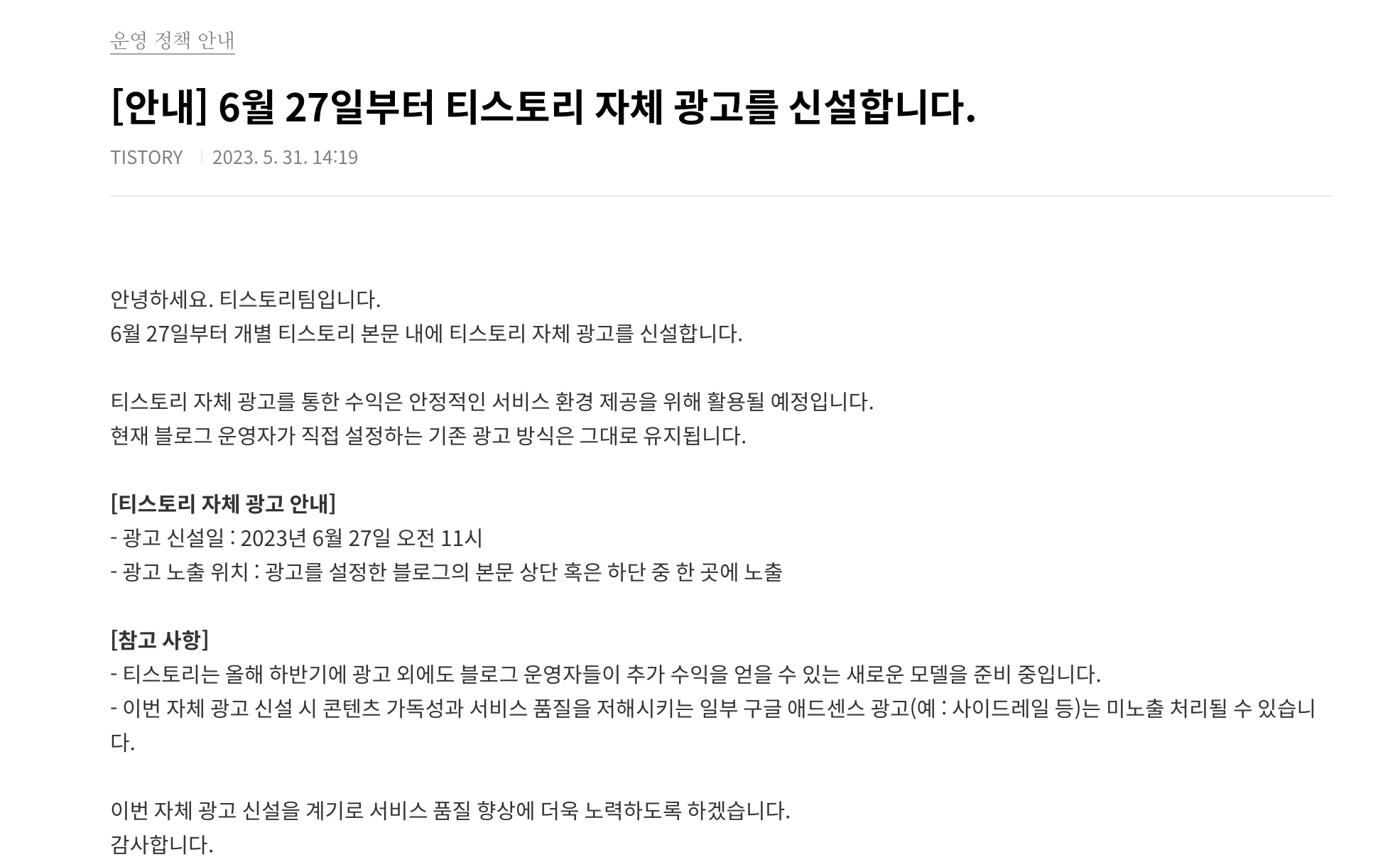 일단 티스토리에선 지난 6월 27일 자체 광고를 신설했습니다.