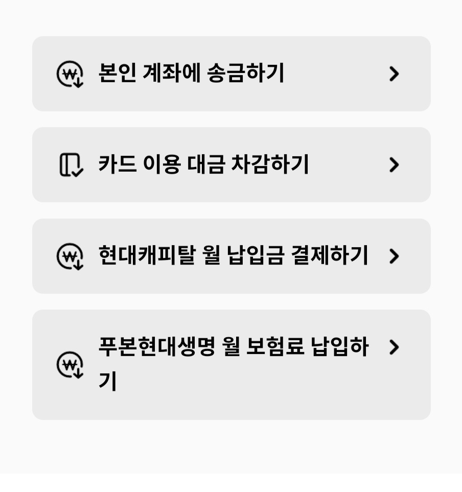 H-Coin은 카드 이용 대금을 차감하거나, 현대캐피탈 월 납입금을 결제하거나 푸본현대생명 보험료 납입에도 쓰일 수 있지만 저는 현금으로 바꾸는게 최우선이기 때문에 가장 맨 위에 있는 본인 계좌에 송금하기를 누릅니다.