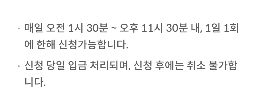 매일 오전 1시 30분부터 밤 11시 30분 사이로 하루에 1번만 입금 신청이 가능하다는 점.