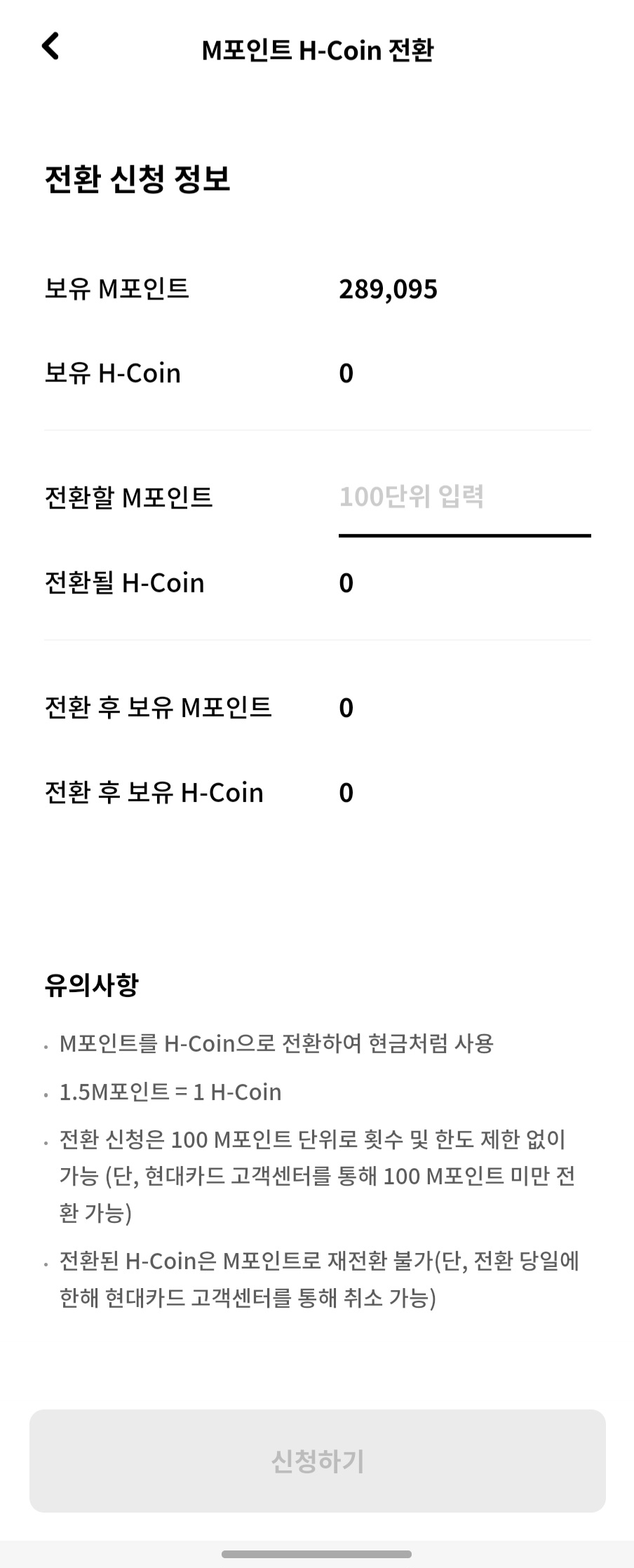 -먼저 m포인트를 현대h코인으로 바꿔줍니다. (이 때 2/3정도의 가치로 변환됩니다.)