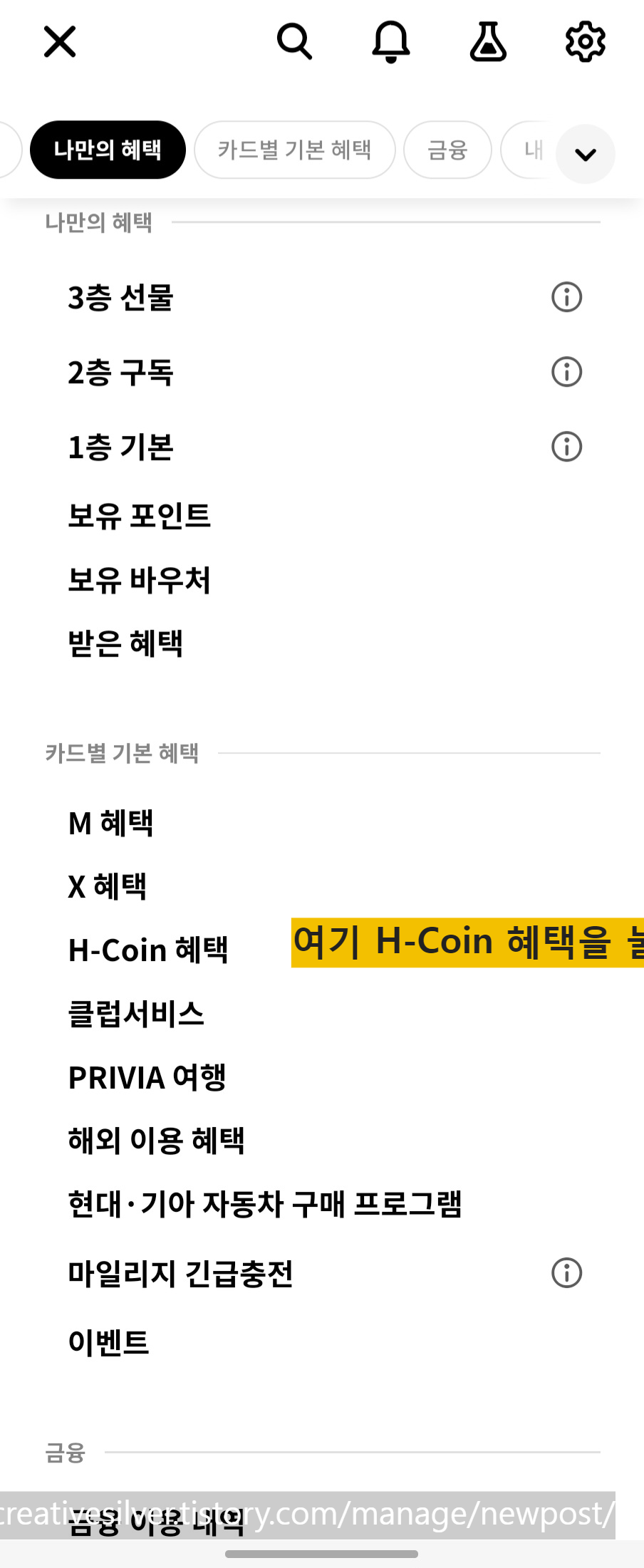 여기서 '카드별 기본 혜택' 에서 H-Coin 혜택을 눌러줍니다.