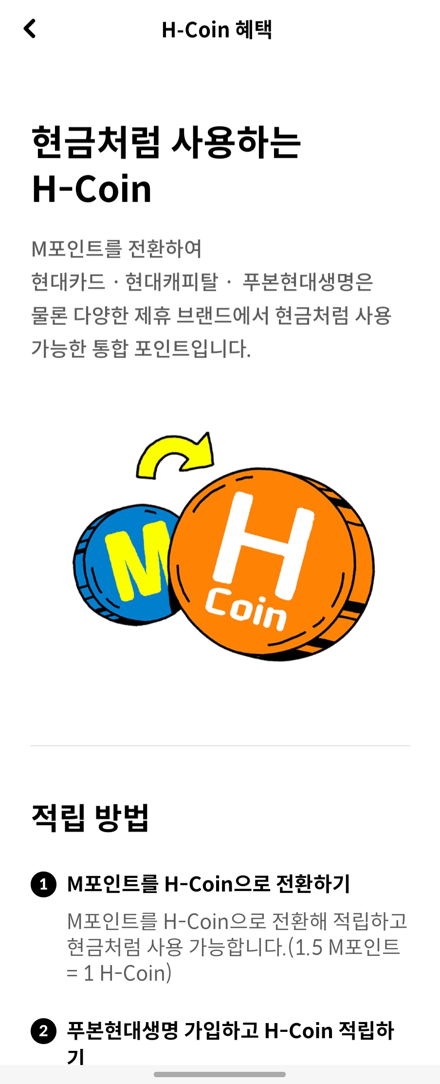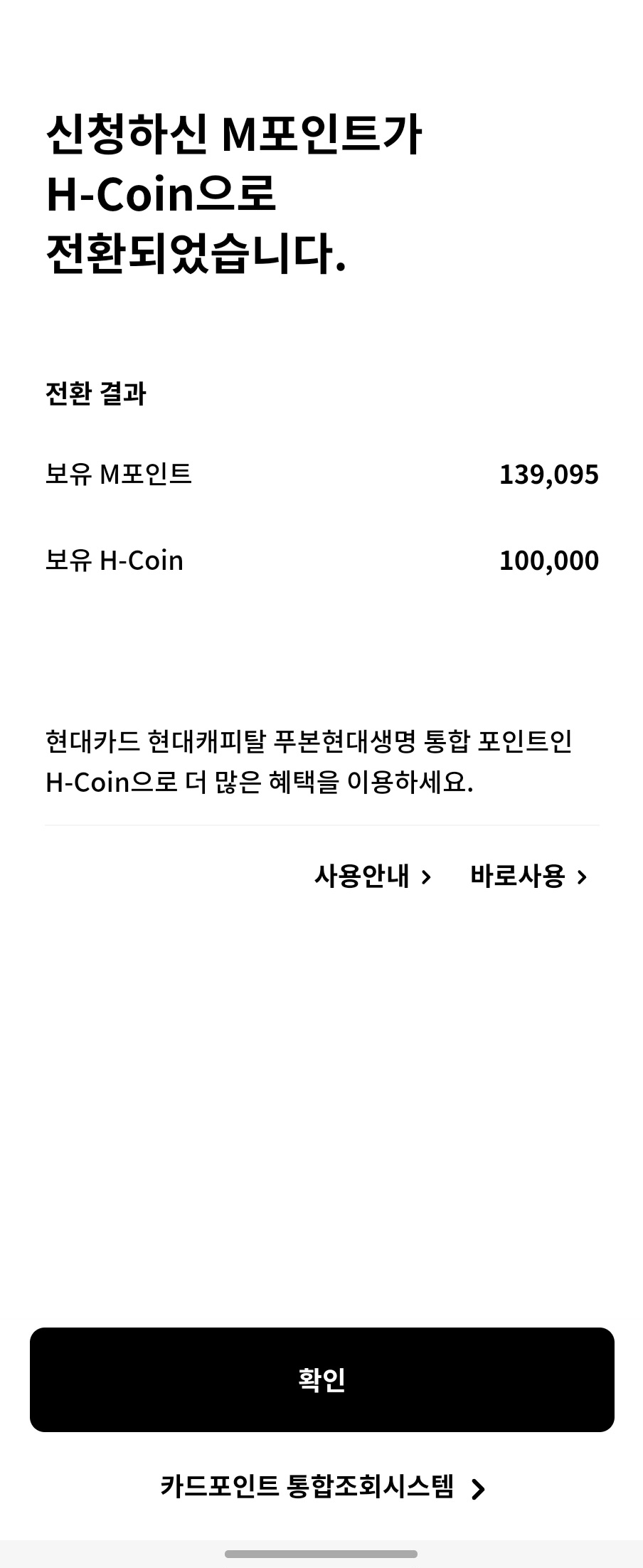 일단 M포인트의 현금화 과정은 이렇습니다.현대카드 M포인트 - (2/3가치로 변환) -> 현대 H Coin -> 은행계좌로 입금