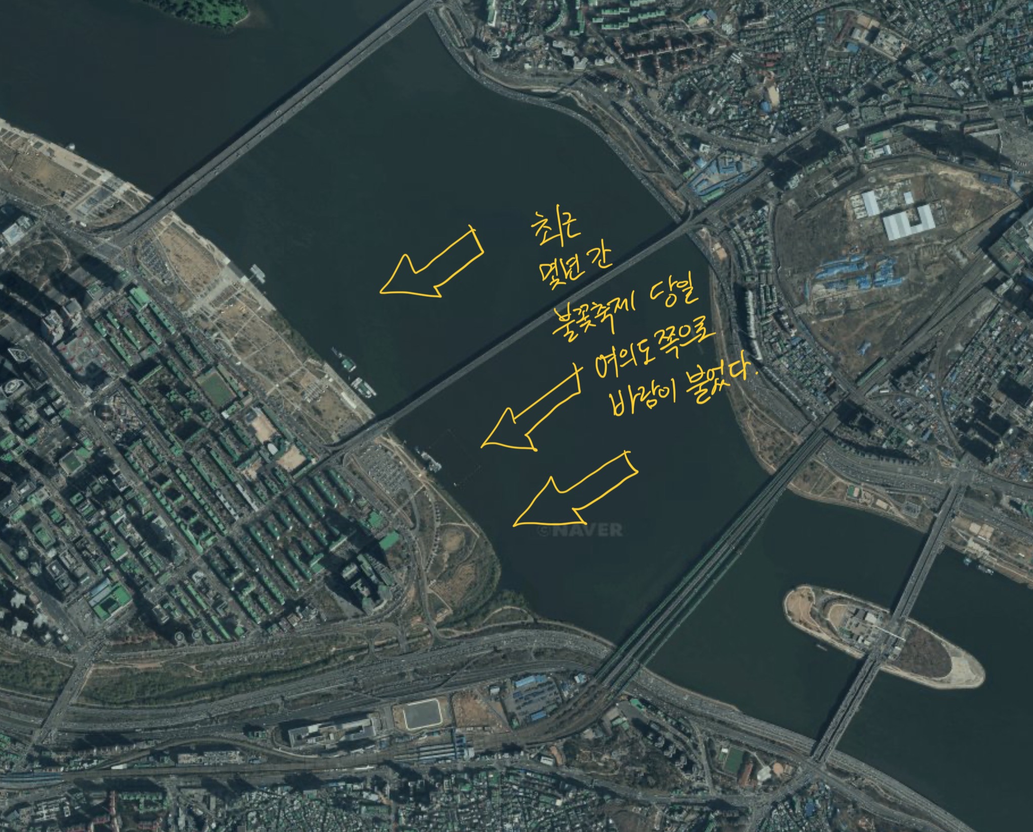 바람의 방향도 꽤 중요합니다. 사실 불꽃축제 감상에 큰 영향을 주는 요소입니다. 불꽃 감상의 3요소라 할 수 있는 불꽃, 소리, 연기 중 연기와 가장 밀접한 관련이 있습니다.