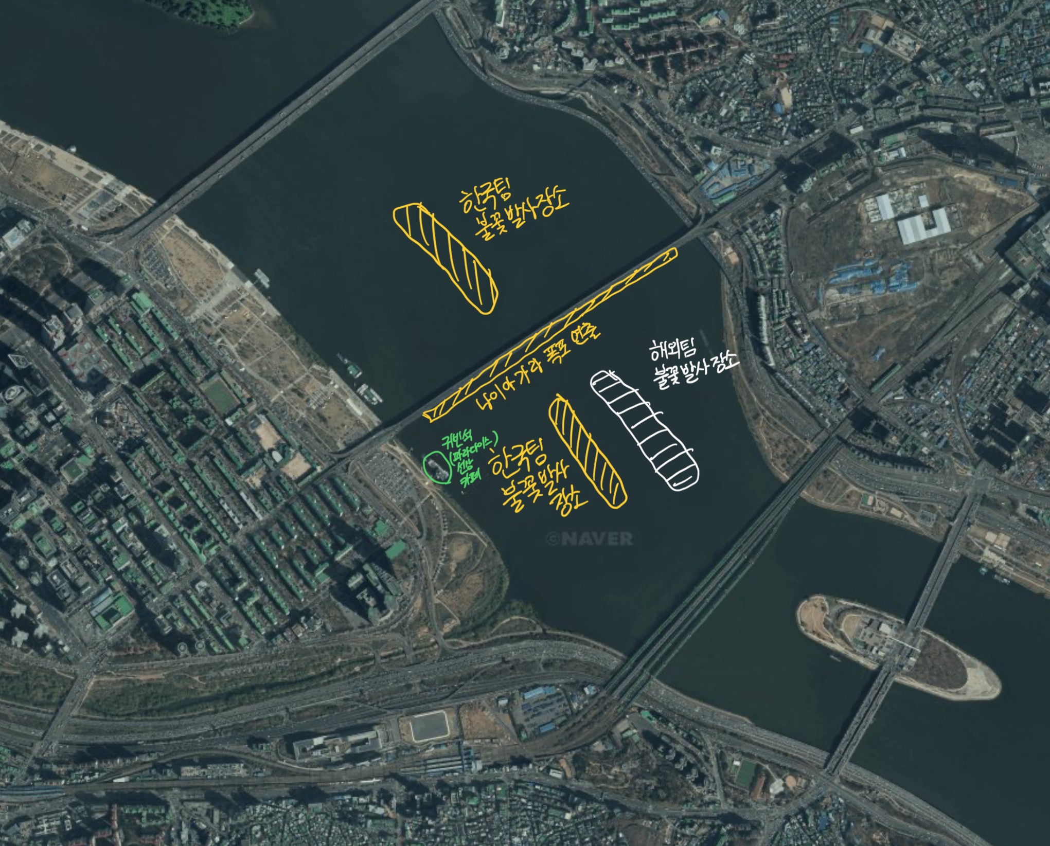 꽤 오래 전부터 한국팀의 불꽃 연출 구간이 마포대교~원효대교 사이로 확장이 되긴 했습니다. 하지만 이 때는 낮은 고도에서, 지상에서 터지는 장치연화만 연출이 되었습니다. 하지만 작년부터는 타상연화까지. 한국 한화팀의 모든 연출을 원효대교~한강철교 뿐만 아니라 마포대교~원효대교사이에도 2곳에서 동시에 연출이 됩니다. (다만 앞선 중국팀과 폴란드팀의 연출은 원효대교와 한강철교 사이에만 이루어집니다.) 그렇기 때문에 ‘한화 팀의 연출 위주로 보고 싶다’고 한다면 마포대교~원효대교 사이에서의 관람도 괜찮은 선택지가 될 수 있습니다.